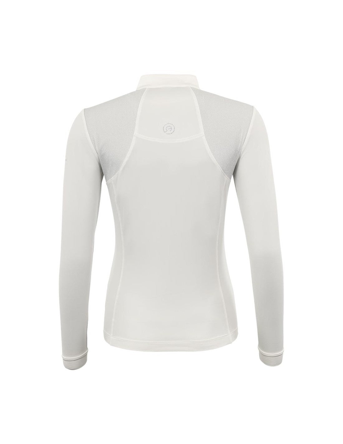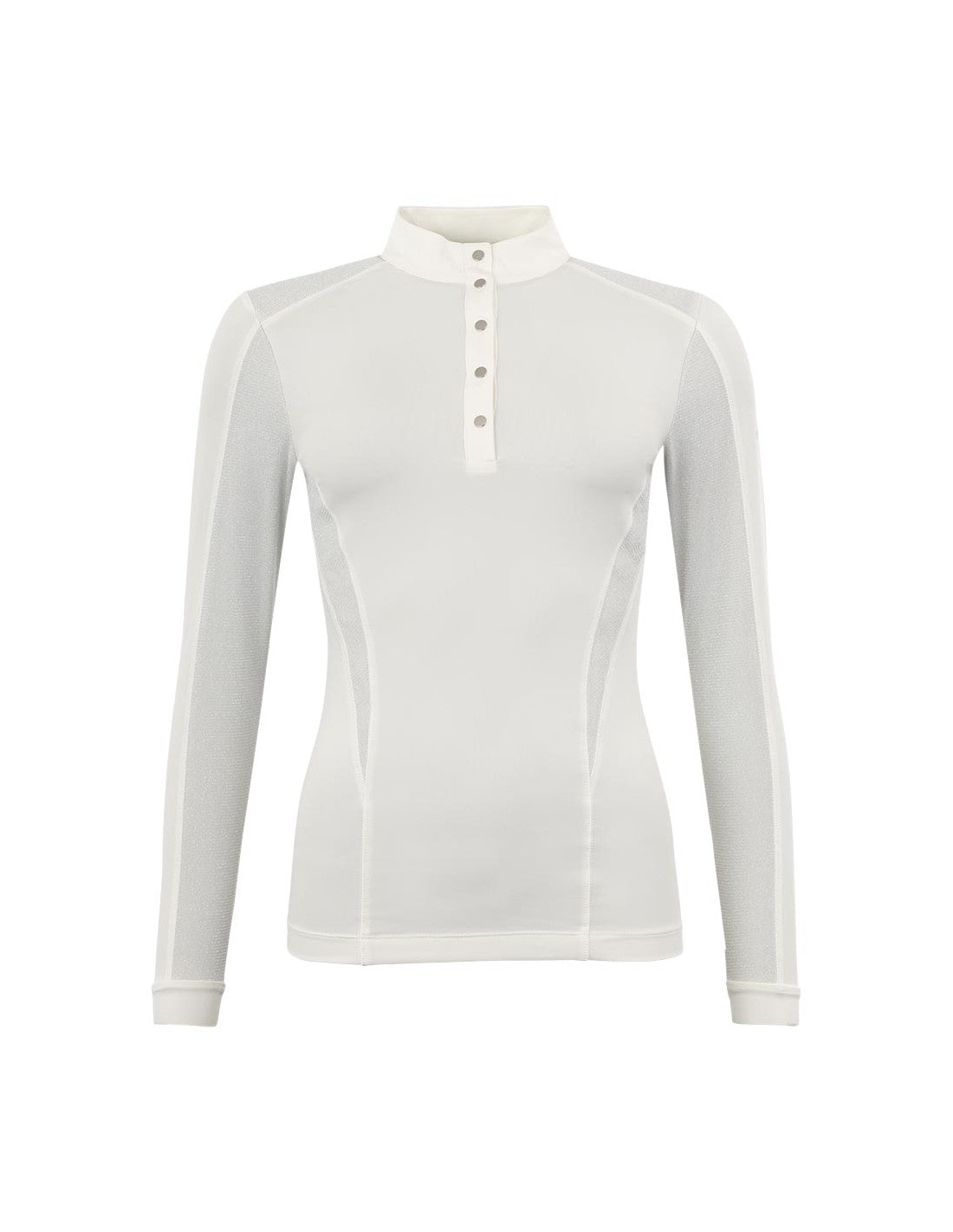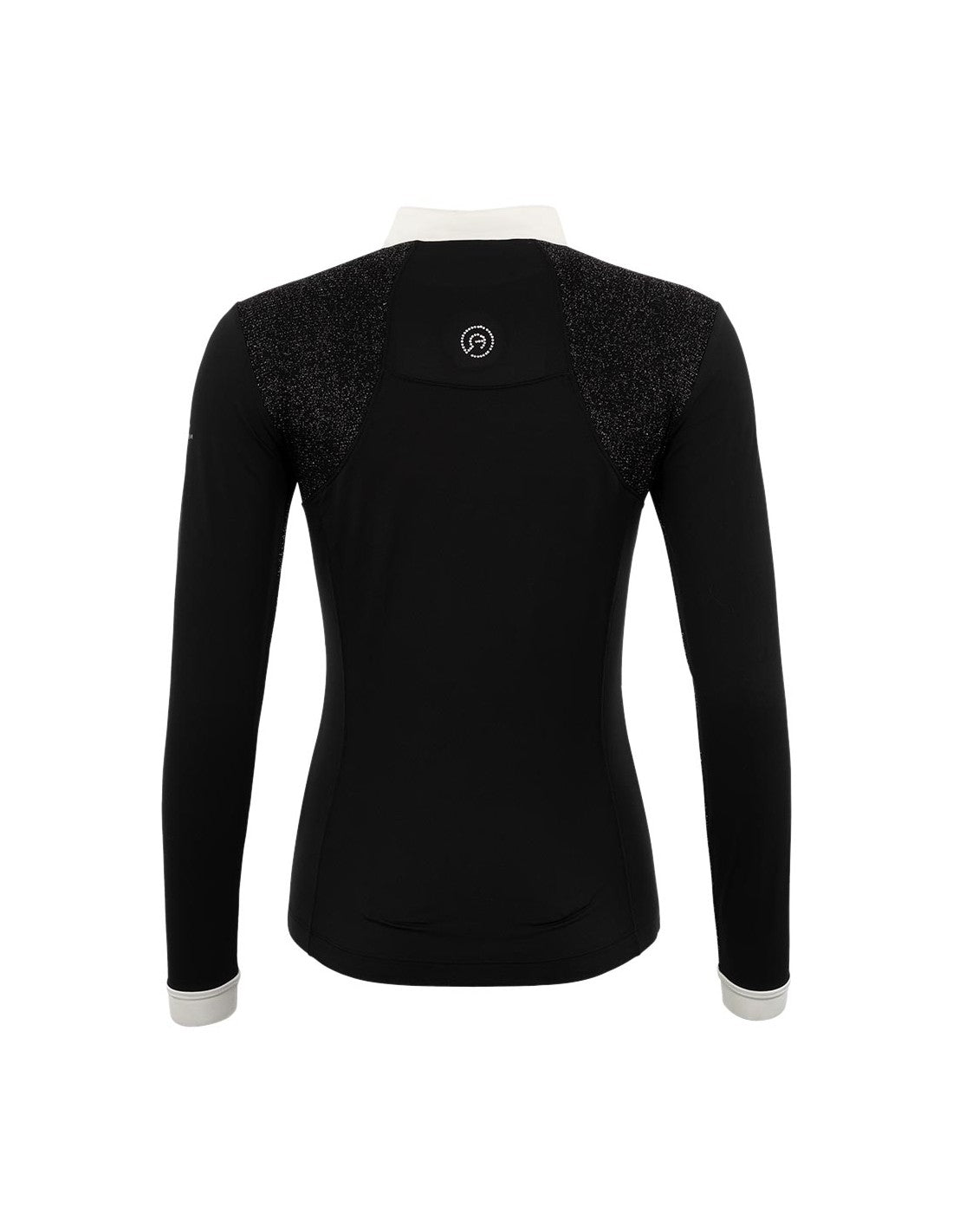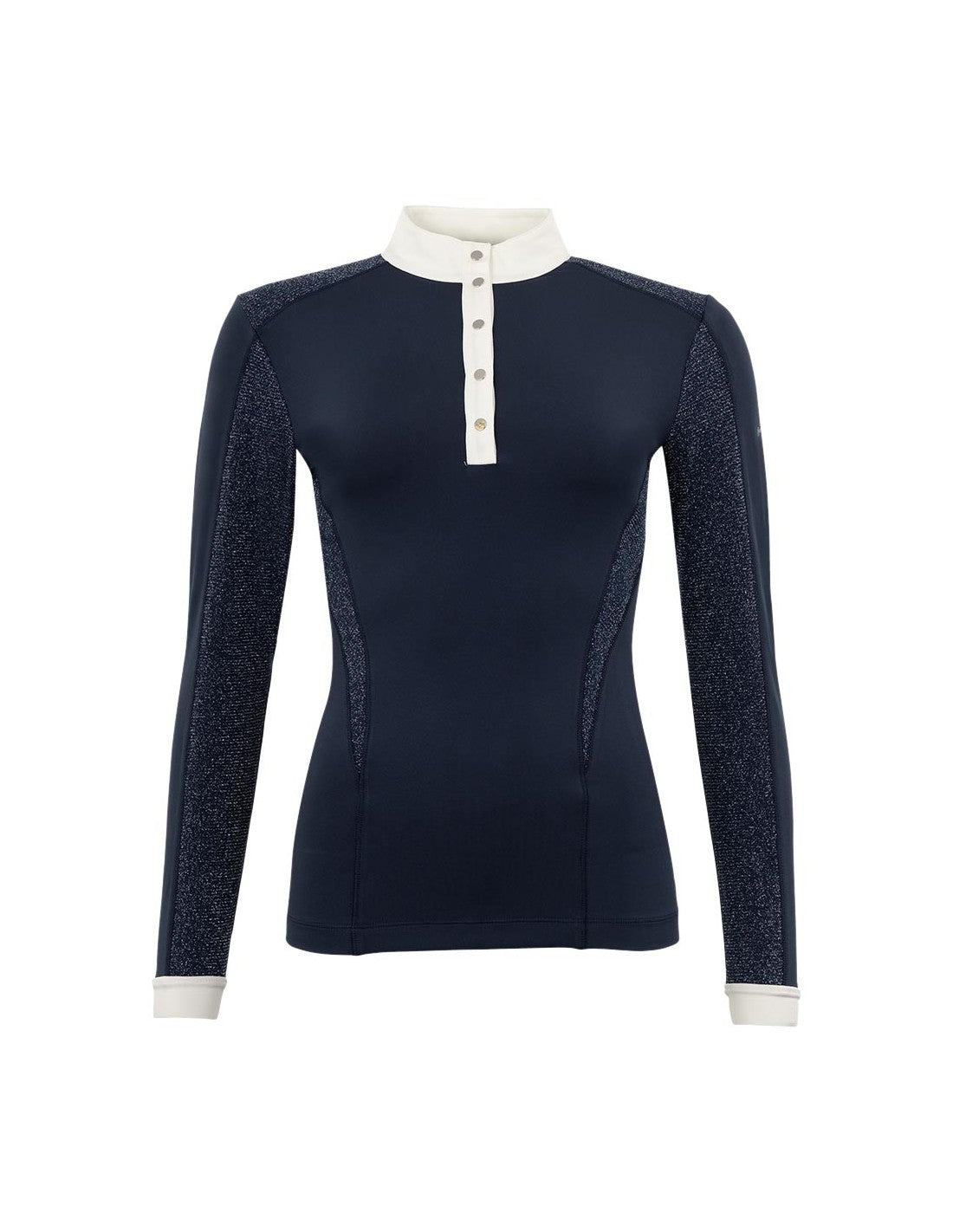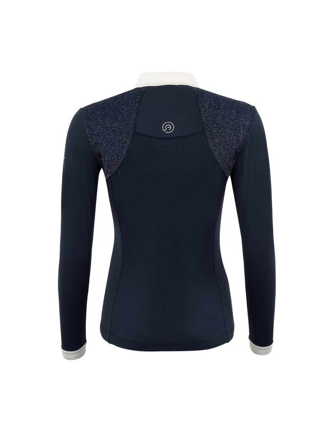 This airy, stretchable competition shirt has long sleeves made of breathable mesh. The mesh material features a stylish glitter stripe pattern and is also located at the front. The concealed zipper at the back, the silver stitching and the ANKY® logo on the stand-up collar finishes this shirt in a graceful way.