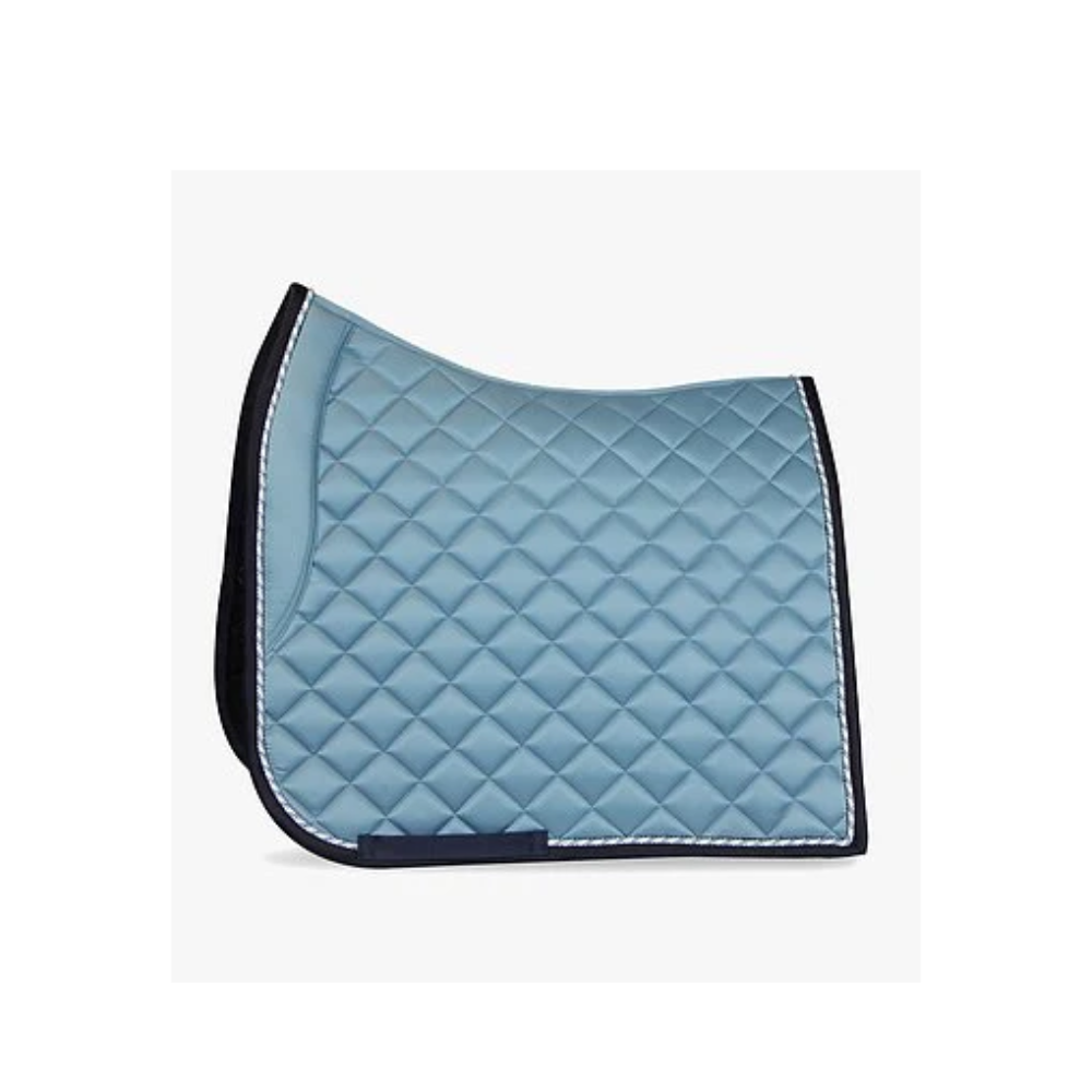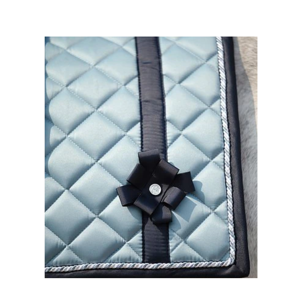 Anatomical saddle pad with double piping and a beautiful decorative bow down the near-side. The saddle pad has unique stop cushions to keep it in place and avoid friction. The inside is covered with an antibacterial quick-dry material that helps to transport away moisture and sweat. Stunning aqua blue with navy trim and a classic diamond quilting. Anatomical design with extra freedom for the withers Stop cushions to prevent the saddle pad from sliding when used Quick-dry, moisture-wicking inside Antibacterial bottom Dirt repellent material on the top Matching accessories available with Bow Polos and Bow Fly Hat.