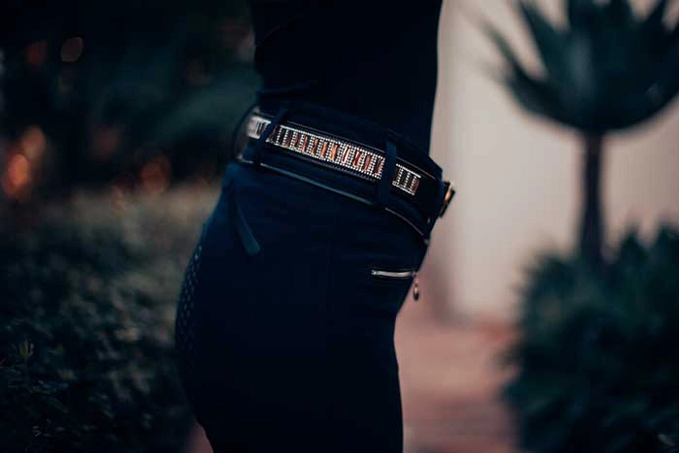 Exclusive dark brown leather belt with crystal details in rosé and white. The belt is perfect for your next competition. Available in a wide size range.