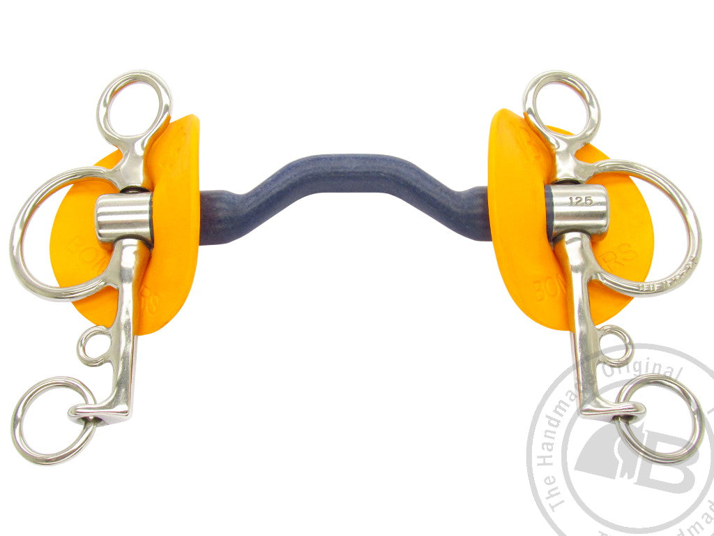 The Pelham has attachments for two reins, one near the mouthpiece and one at the end of the shank. Some riders, may prefer to use rein connectors. The Pelham shank will exert moderate poll pressure and leverage on the mouthpiece and curb. The Bomber Blue is a unique bit which produces amazing results for the majority of horses. The mouthpiece is ported to give tongue relief. The nylon composite material is light in the mouth and encourages salivation. It is particularly well suited to horses that object to metal mouth pieces.