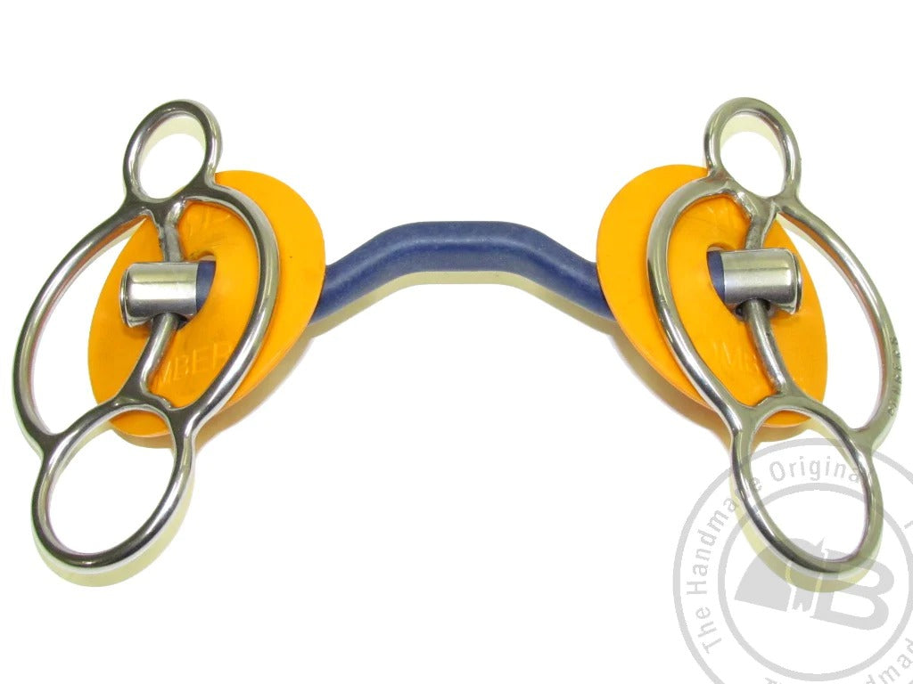 The Pelham has attachments for two reins, one near the mouthpiece and one at the end of the shank. Some riders, may prefer to use rein connectors. The Pelham shank will exert moderate poll pressure and leverage on the mouthpiece and curb. The Bomber Blue is a unique bit which produces amazing results for the majority of horses. The mouthpiece is ported to give tongue relief. The nylon composite material is light in the mouth and encourages salivation. It is particularly well suited to horses that object to metal mouth pieces.