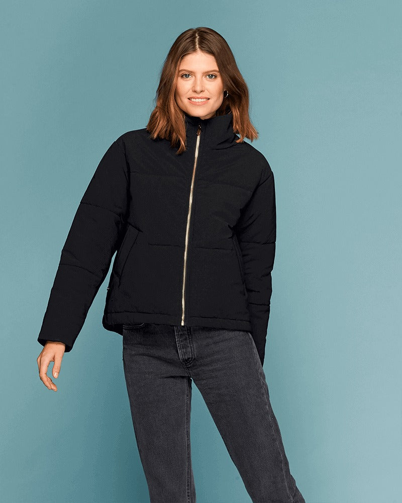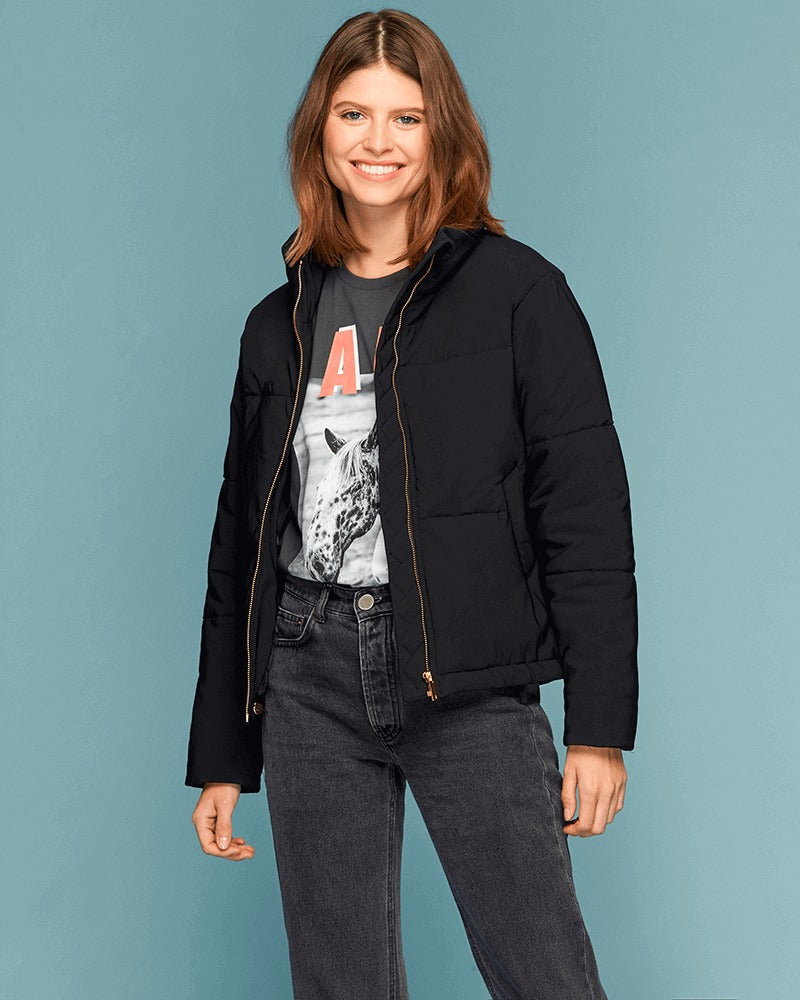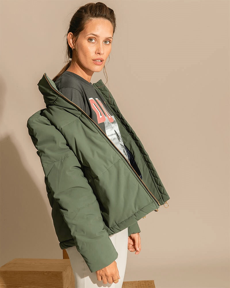 Straight and loose cut. Warm.Water-repellent. Zip fastener on the front side. 100% silicon padding that keeps you warm during cold winters.