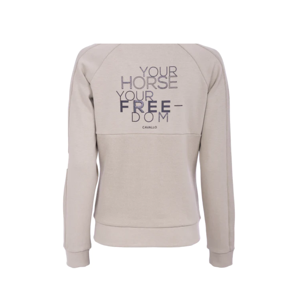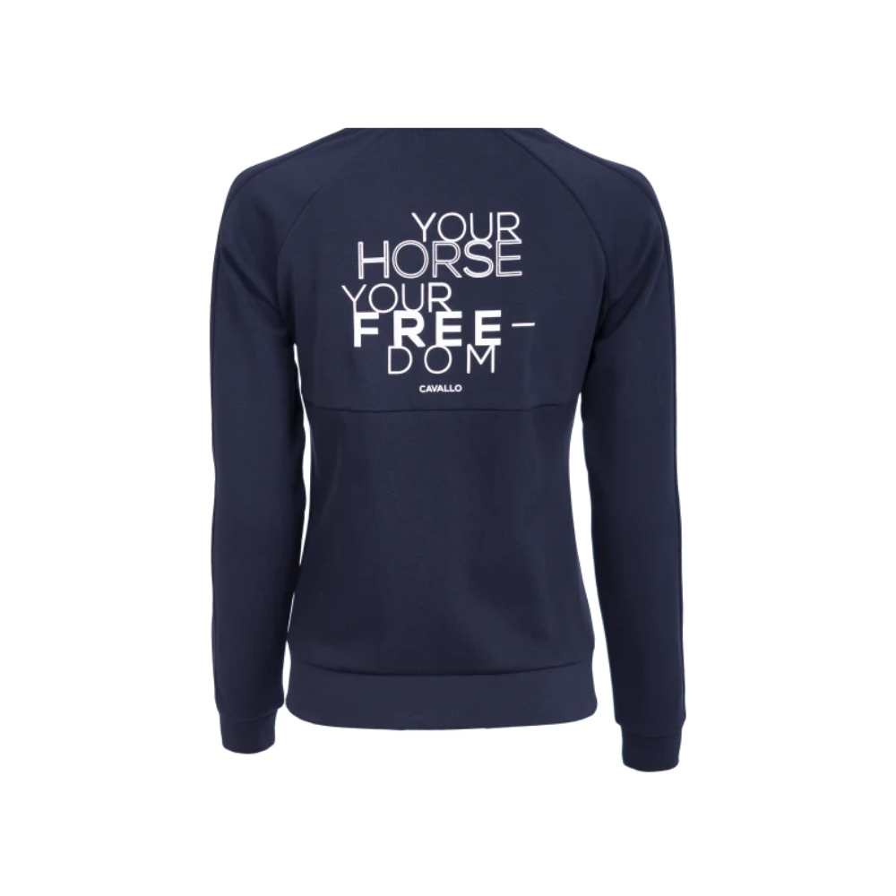 Experience a wearable masterpiece with the Cavallo Deyna Casual Ladies Stand-Up Collar Jacket. The large Cavallo artwork on the back is a bold statement of individuality. Revel in the visual delight of crystal-adorned jewelry handles on all visible zippers, adding a touch of glamour to functionality. The printed lettering parallel to the left front pocket is a subtle yet impactful detail that makes this jacket more than an attire—it's a canvas of artistry in motion.