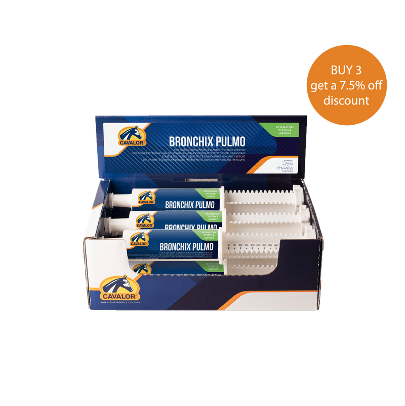 A poorly functioning respiratory system is a common factor in sport horses that don’t always quite manage to exhibit their full potential. For outstanding performance, efficiently transported oxygen is crucial. Cavalor® Bronchix Pulmo is designed for optimal support of the lungs and airways. It improves the elasticity and resilience of the blood vessels and facilitates respiration. Clinical testing on active racehorses has demonstrated these effects.