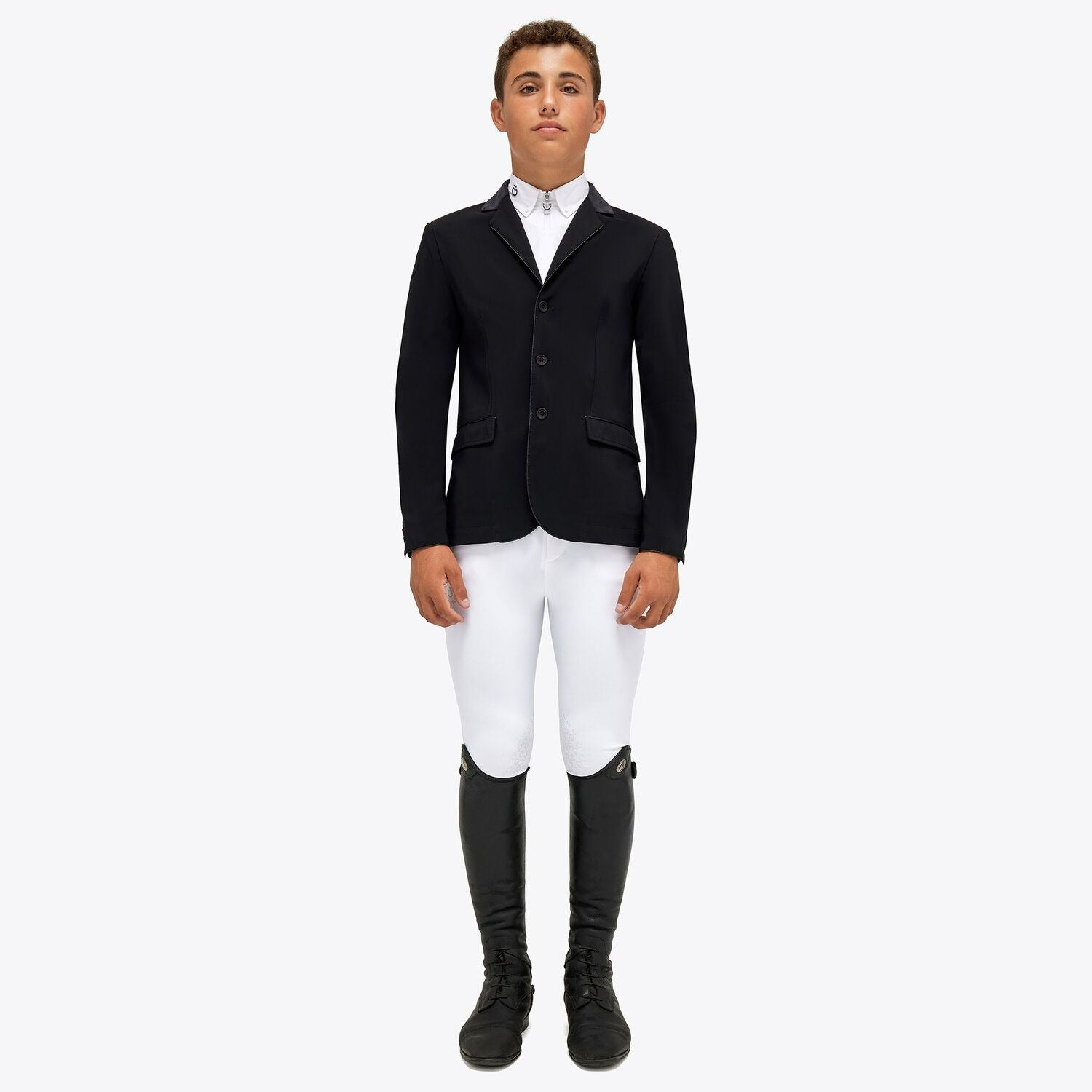 This boy's classic riding jacket is made from technical 4-way stretch jersey, wich is both elegant and highly performing. It helps breathability and follows your body movements, while providing antibacterial properties and water repellence. The jacket features an alcantara collar and contrasting piping on the edges, two front pockets and buttons fastening. The jacket is refined by an embroidered logo on the shoulder.