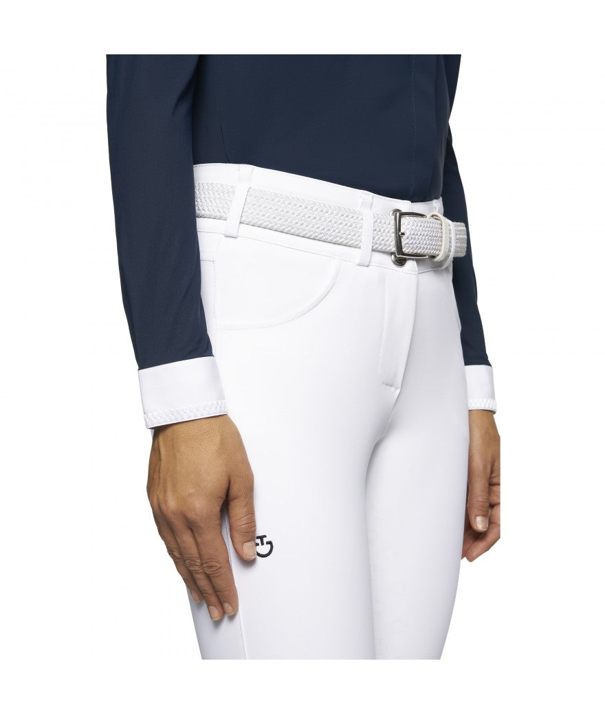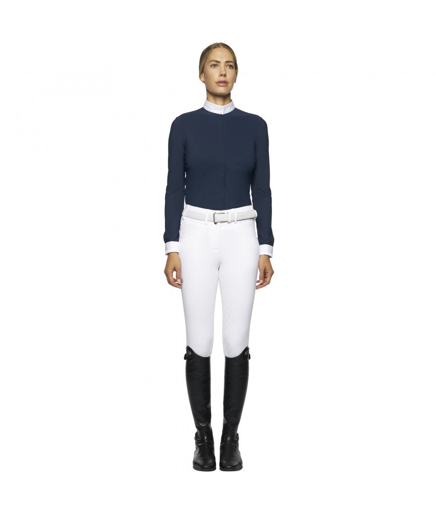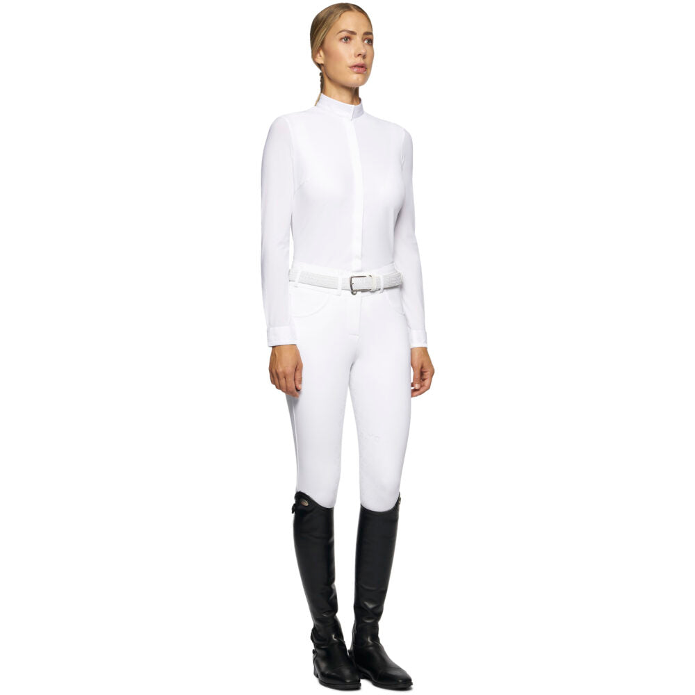 Women's long-sleeved competition shirt with covered buttons.