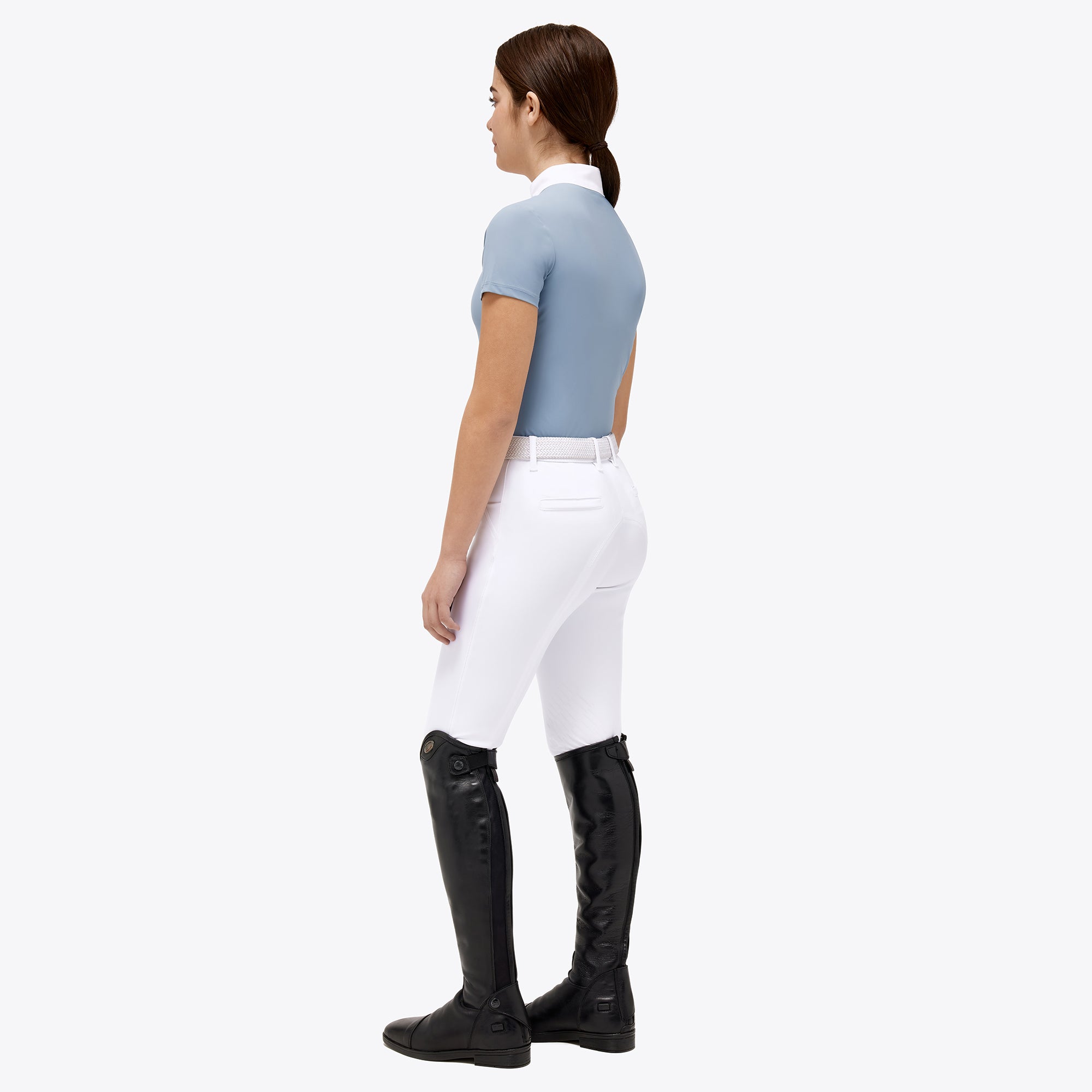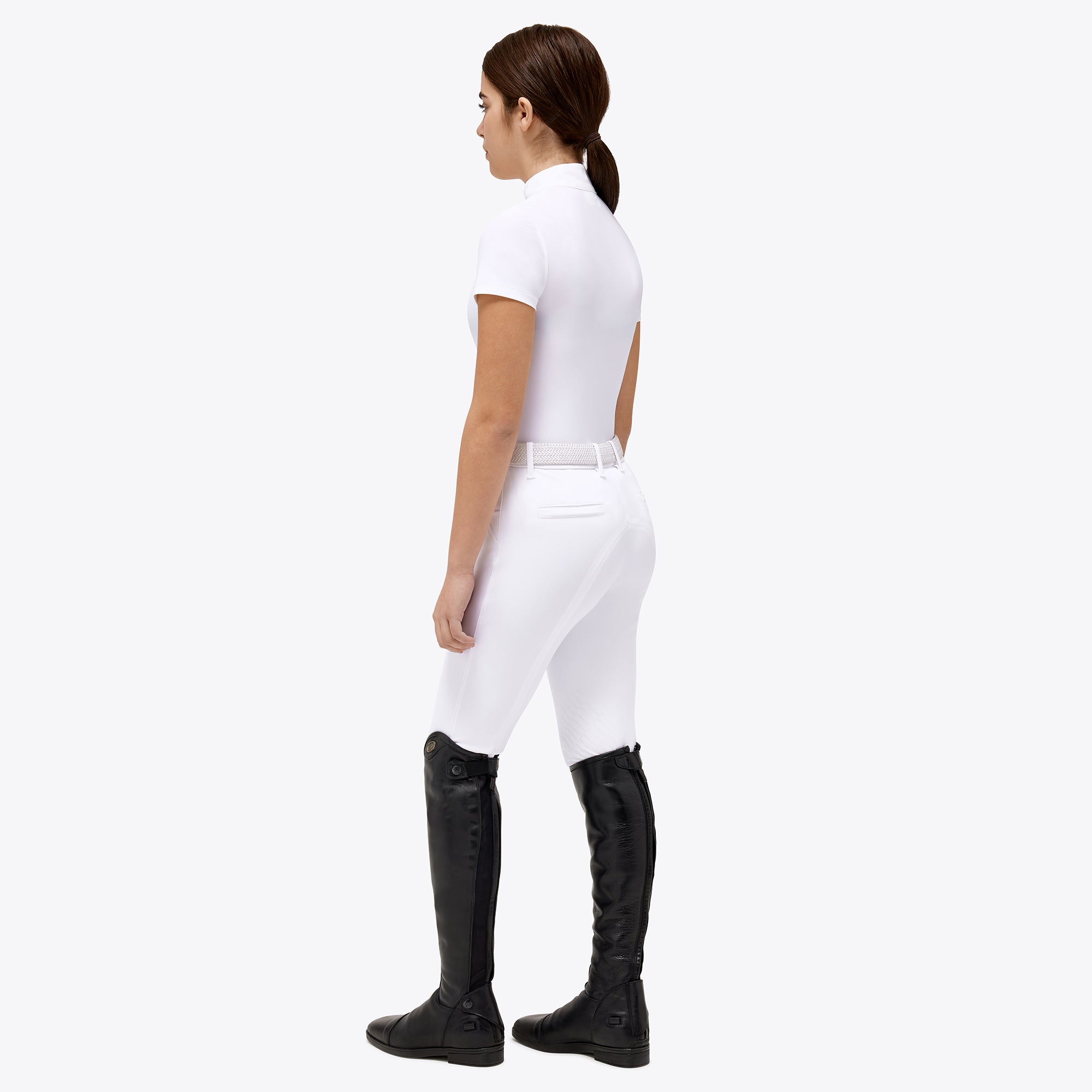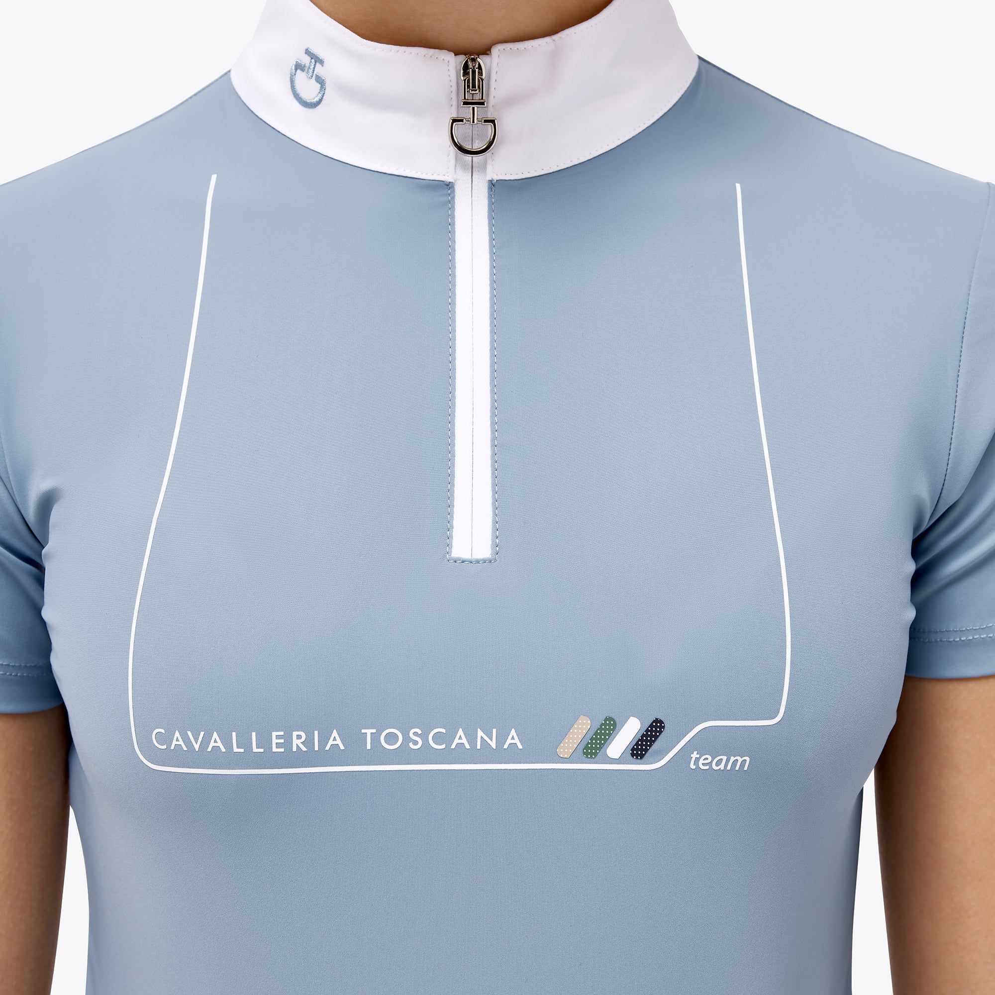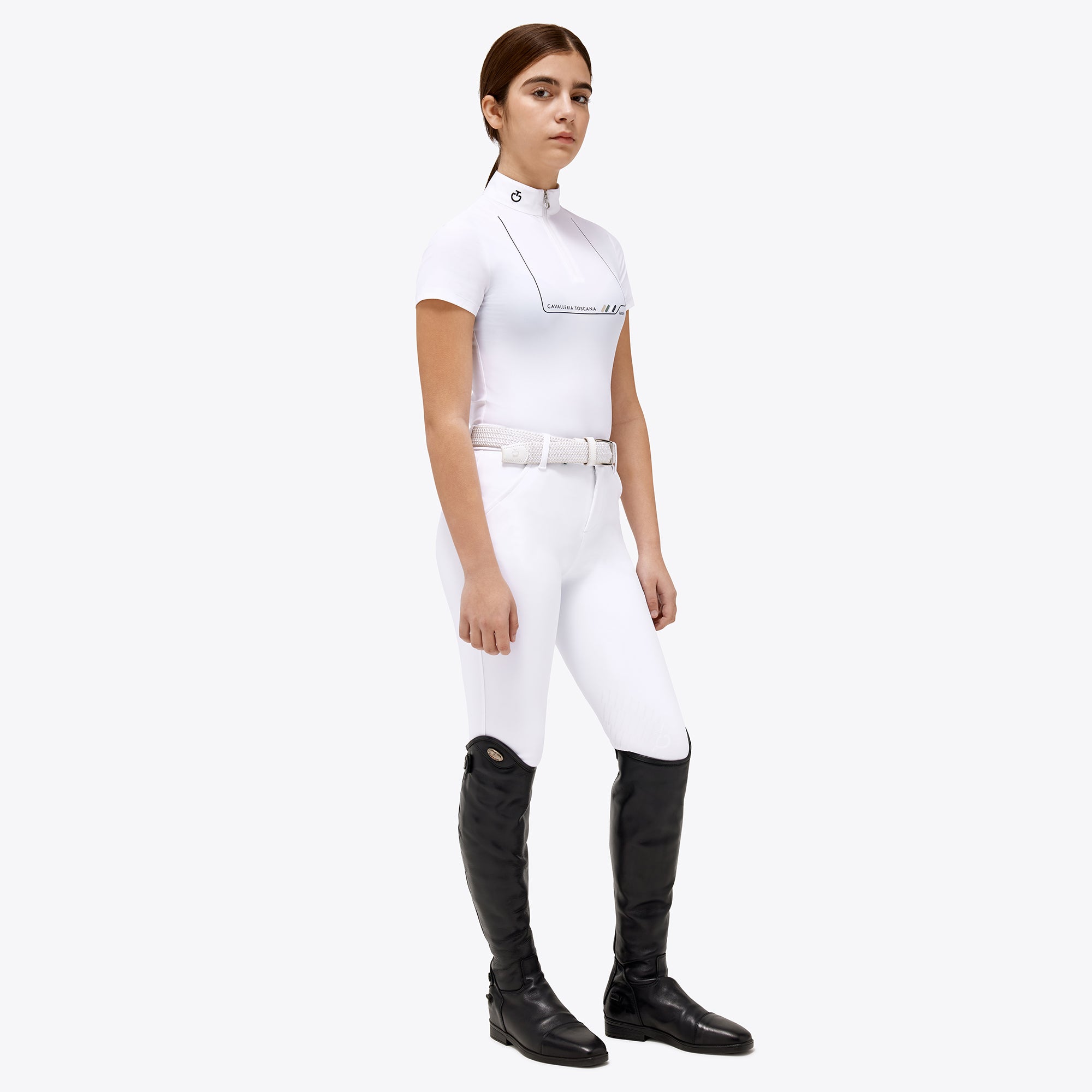 This show shirt from the Team line is dedicated to young female riders who want to wear authentic Cavalleria Toscana style. It comes in a slim, feminine fit and is made of elasticated technical jersey that stretches in all four directions for a full range of movement. The high neck is trimmed by embroidery and the quarter zip is adjusted by a logo-shaped pull tab.