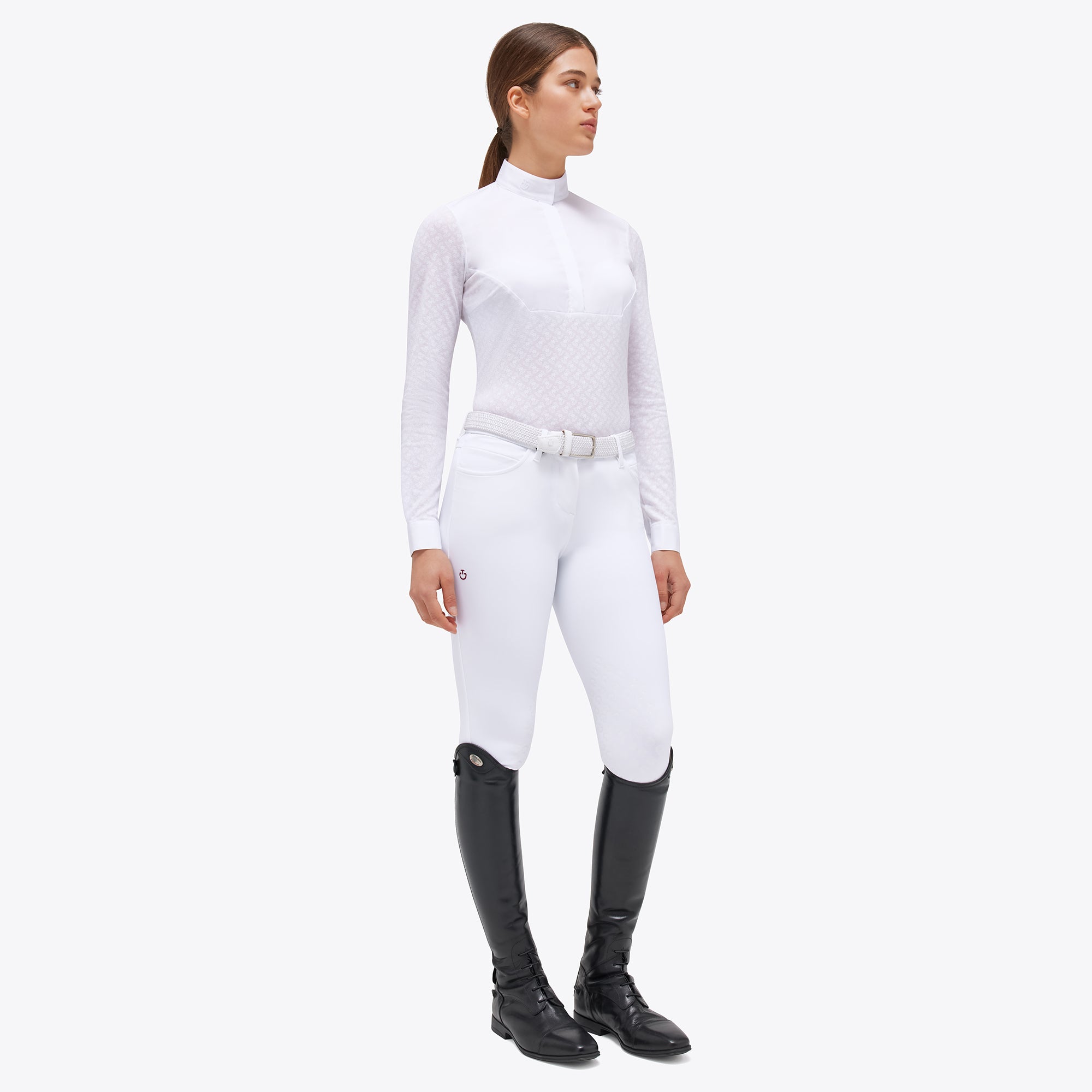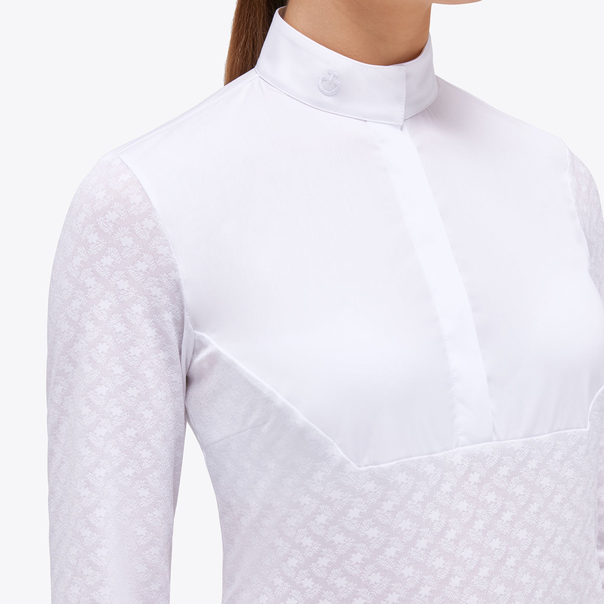 Redesign timeless elegance with the CT L/S Sheer Jacquard Jersey Competition Shirt. The white poplin bib, along with accents on the collar, cuffs, and mock cuffs, brings a touch of classic sophistication to the design. Elevate your riding ensemble, exuding timeless elegance with every stride. Ride in style, making a statement that transcends equestrian fashion norms.