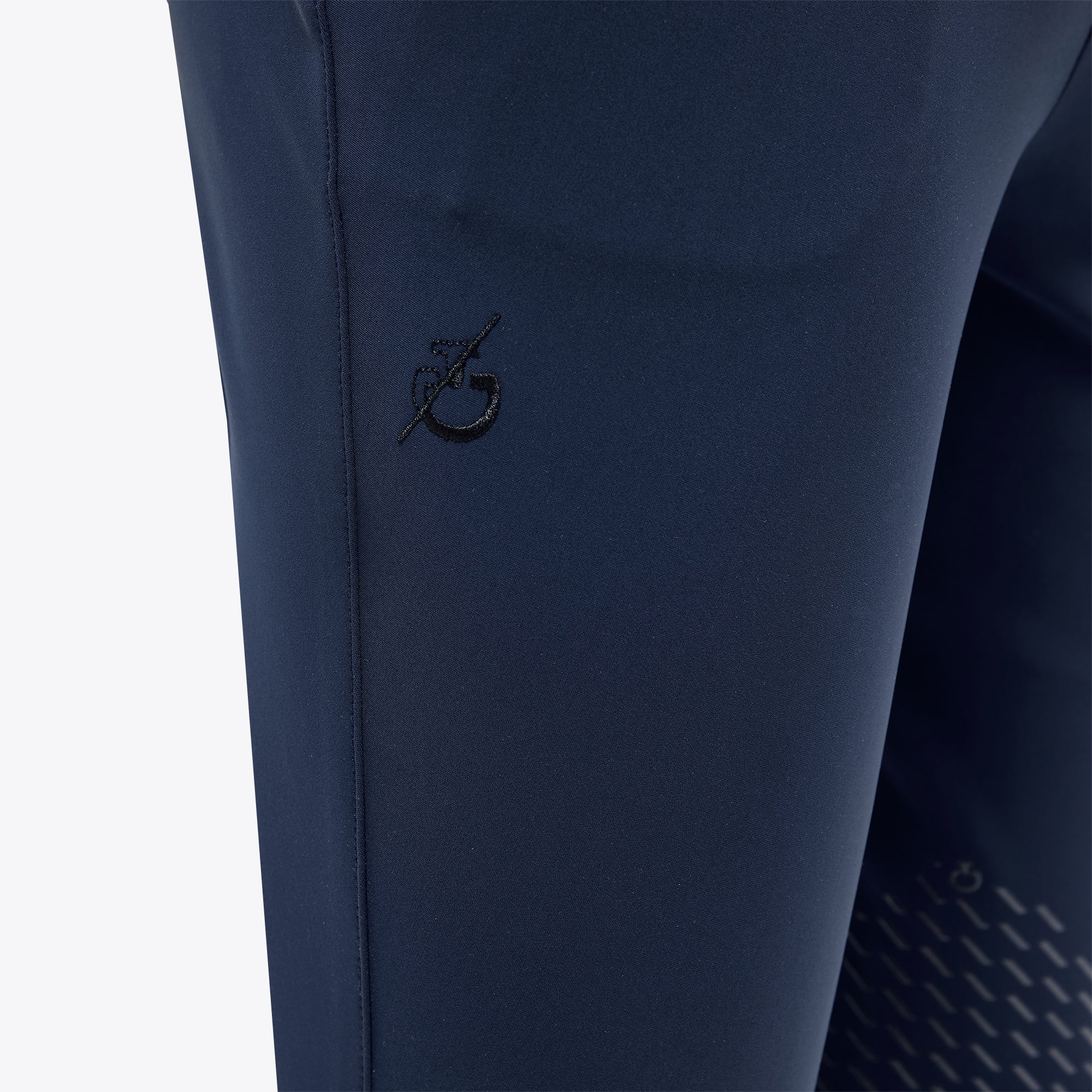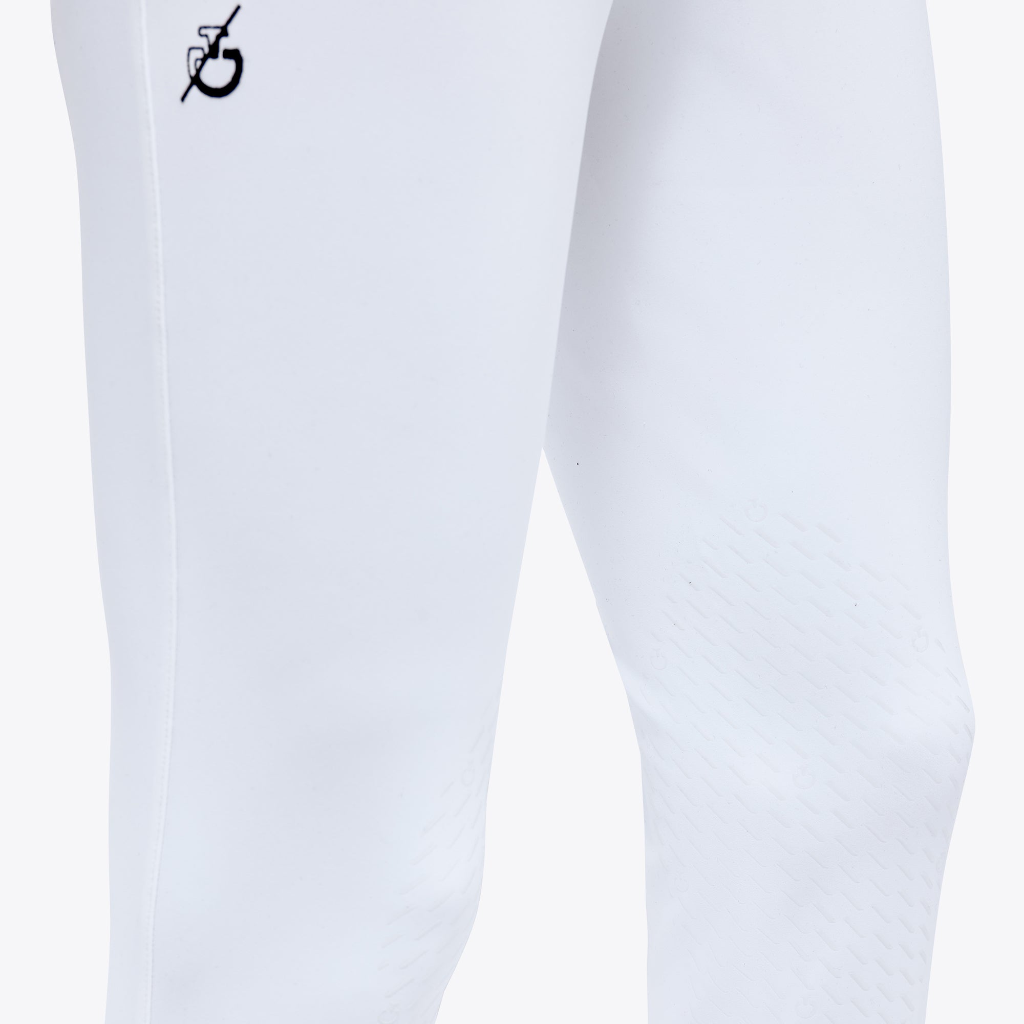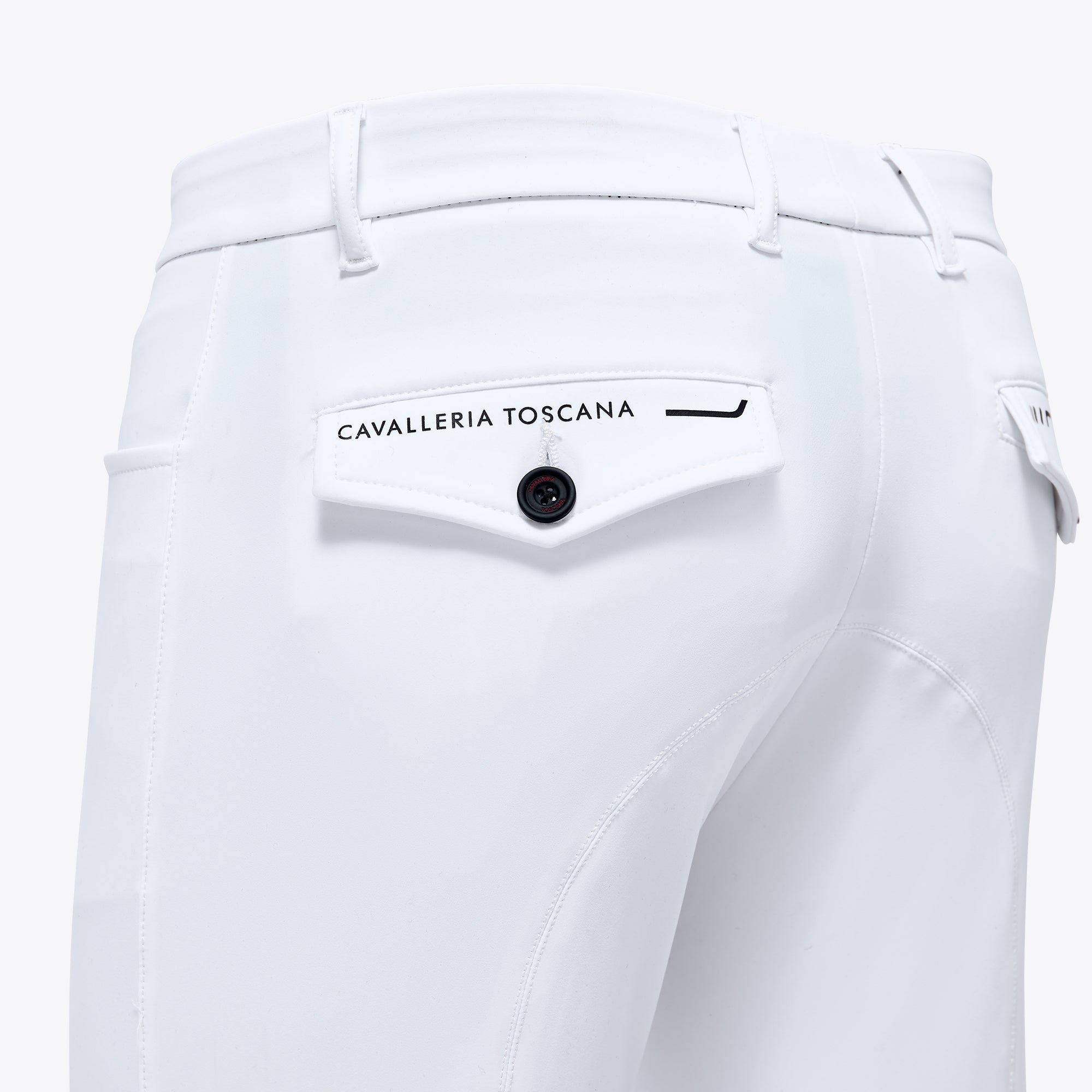 These riding breeches are the perfect fusion of elegance and performance thanks to their combination of distinctive details and functional construction, which ensures comfort and security. In breathable four-way stretch fabric, they have clear silicone grip details on the inner knee to ensure a stable, stay-put ride. The lower leg has stretch ‘sock’ panels that are comfortable worn under boots, decorated by the contrast-colour logo. The back pockets with flap and button are personalised with Cavalleria Toscana lettering.