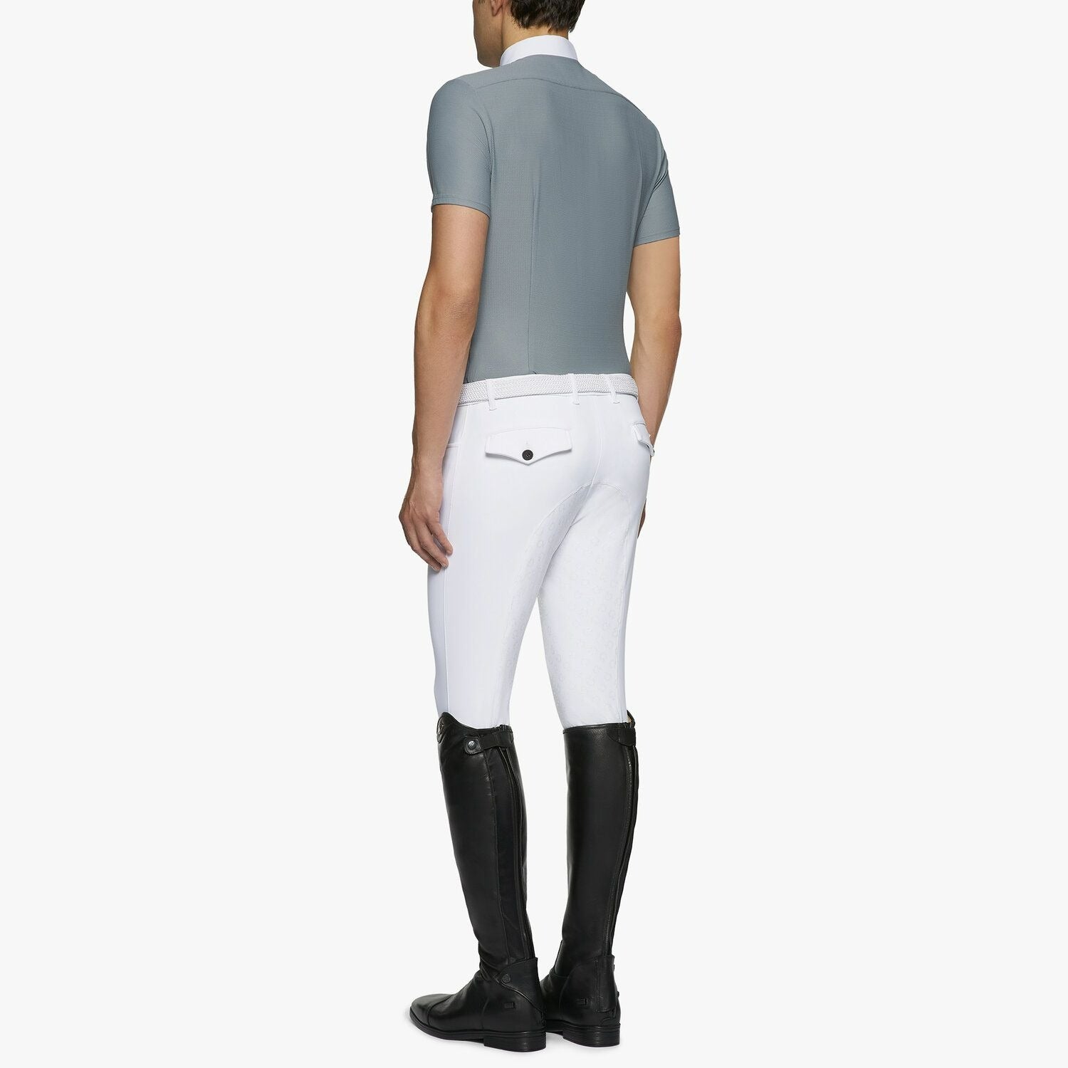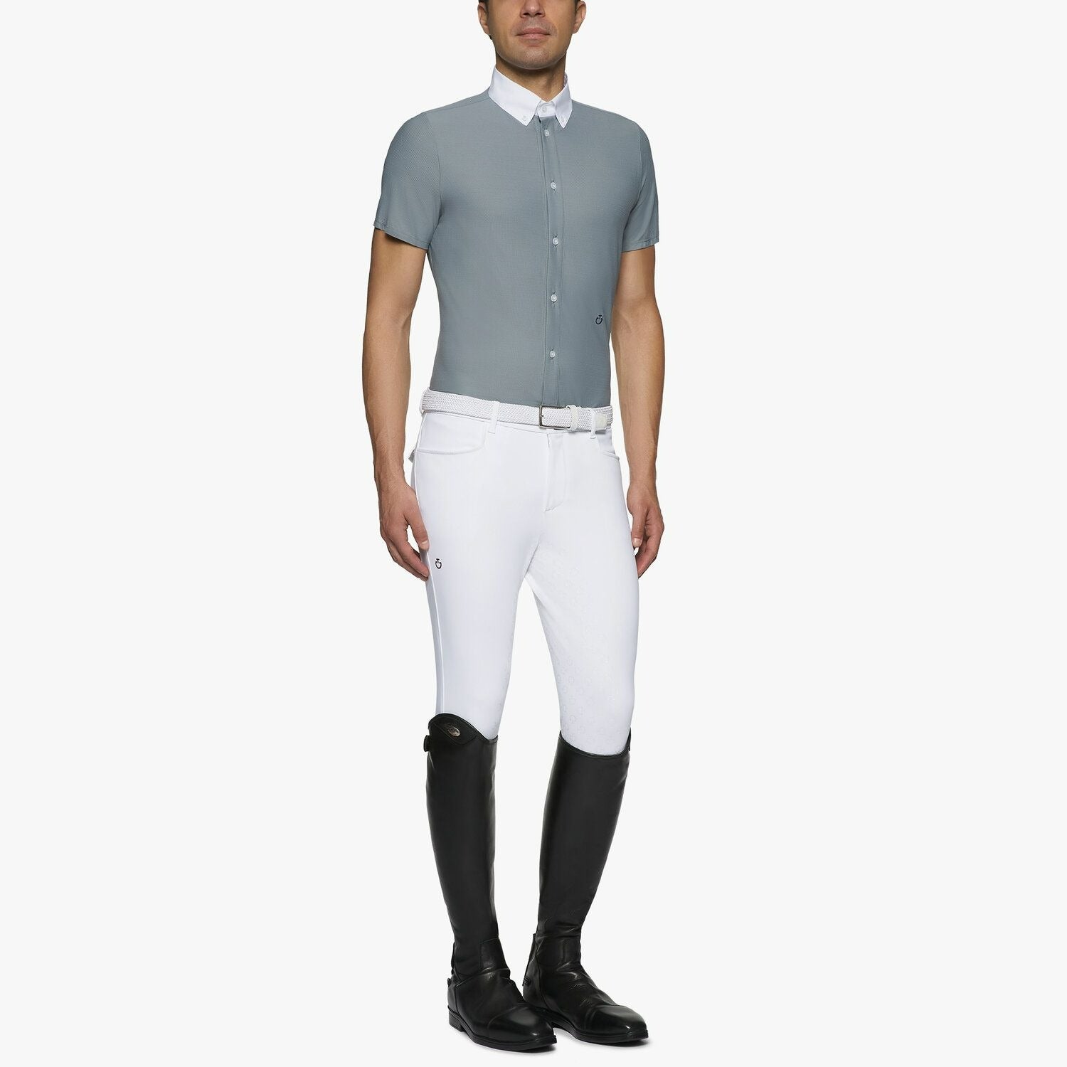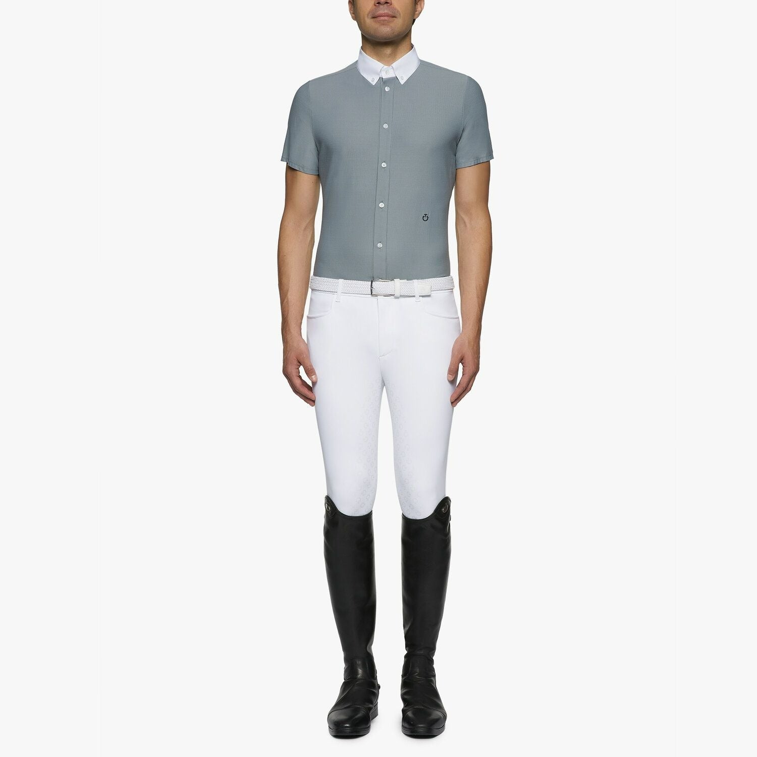 This men's competition shirt combines an elegant design with a soft and elastic 4-way stretch material. The breathable and comfortable fabric makes it perfect for competition use. The classic look is refined by a white button-down poplin collar and a small embroidered logo on the waist. The shirt has a full-length button-down front and can be worn on its own, with a tie, or with a show jacket.