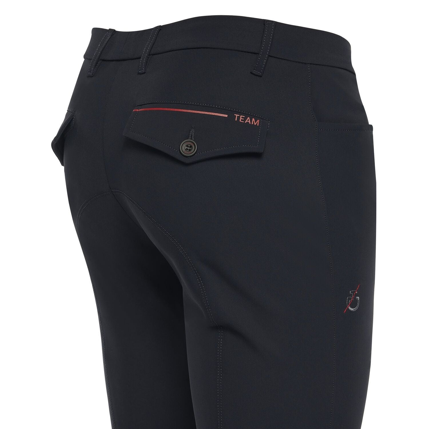 "The men's riding breeches are made from 4-way stretch jersey. The technical material provides high breathability and freedom of movement: this fabric adheres perfectly to your body, without constriction. The transparent knee grip allows the right stability on the horse, while the stretch-knit socks improve the fit beneath your boots. It features two front pockets and a zip up front with botton. CT Team customization.