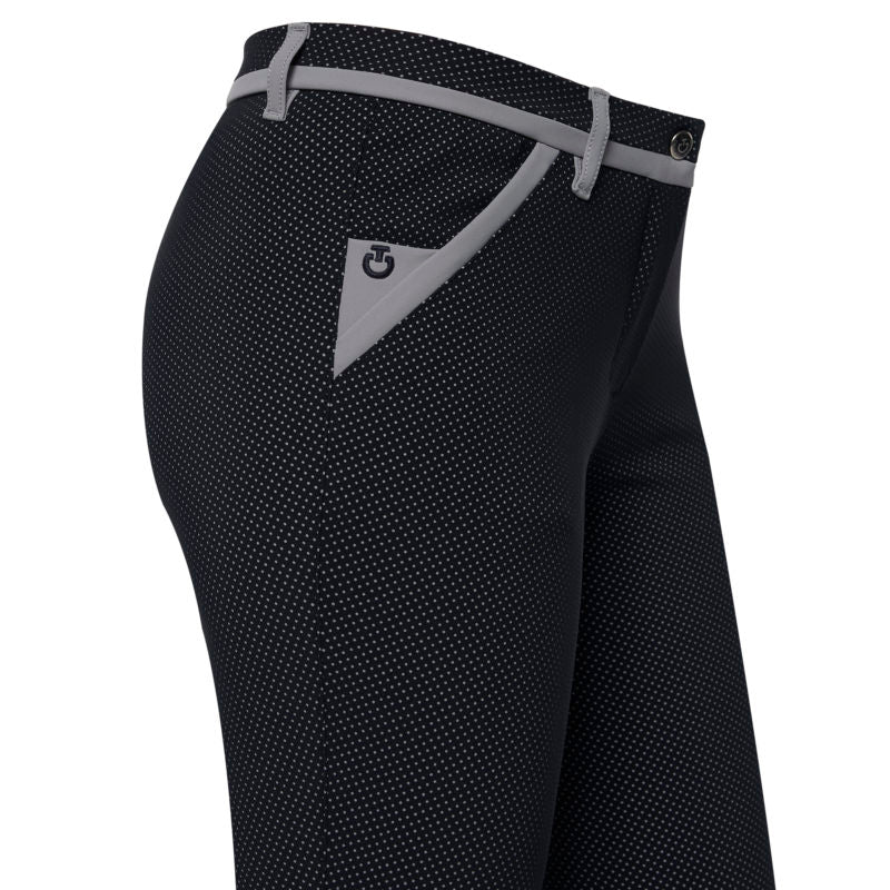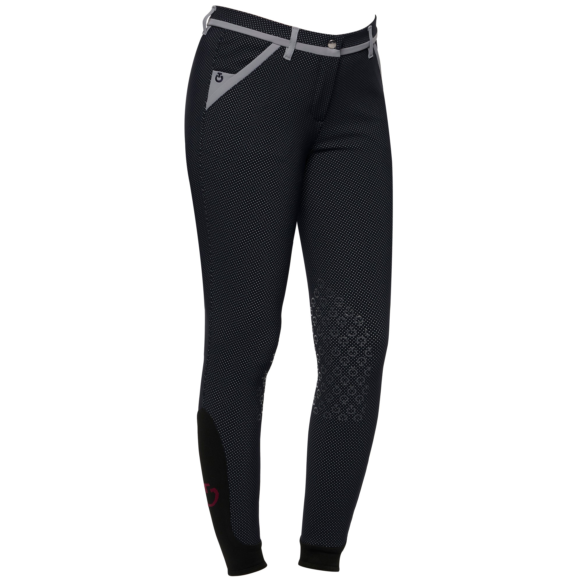 The women's riding breeches are made from 4-way stretch jersey. The technical material provides high breathability and freedom of movement: this fabric adheres perfectly to your body, without constriction. The transparent knee grip allows the right stability on the horse, while the stretch-knit socks improve the fit beneath your boots. It features two front pockets and a zip up front with botton.