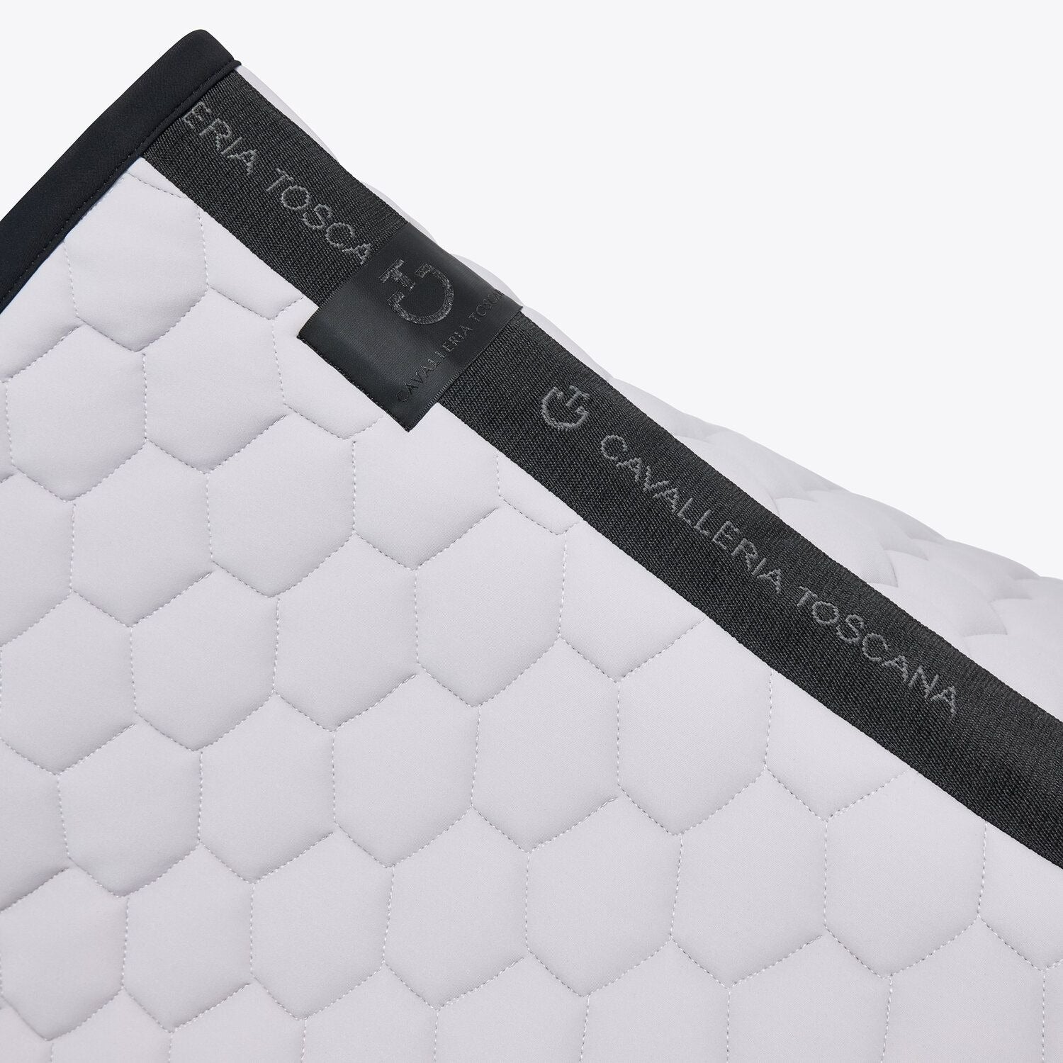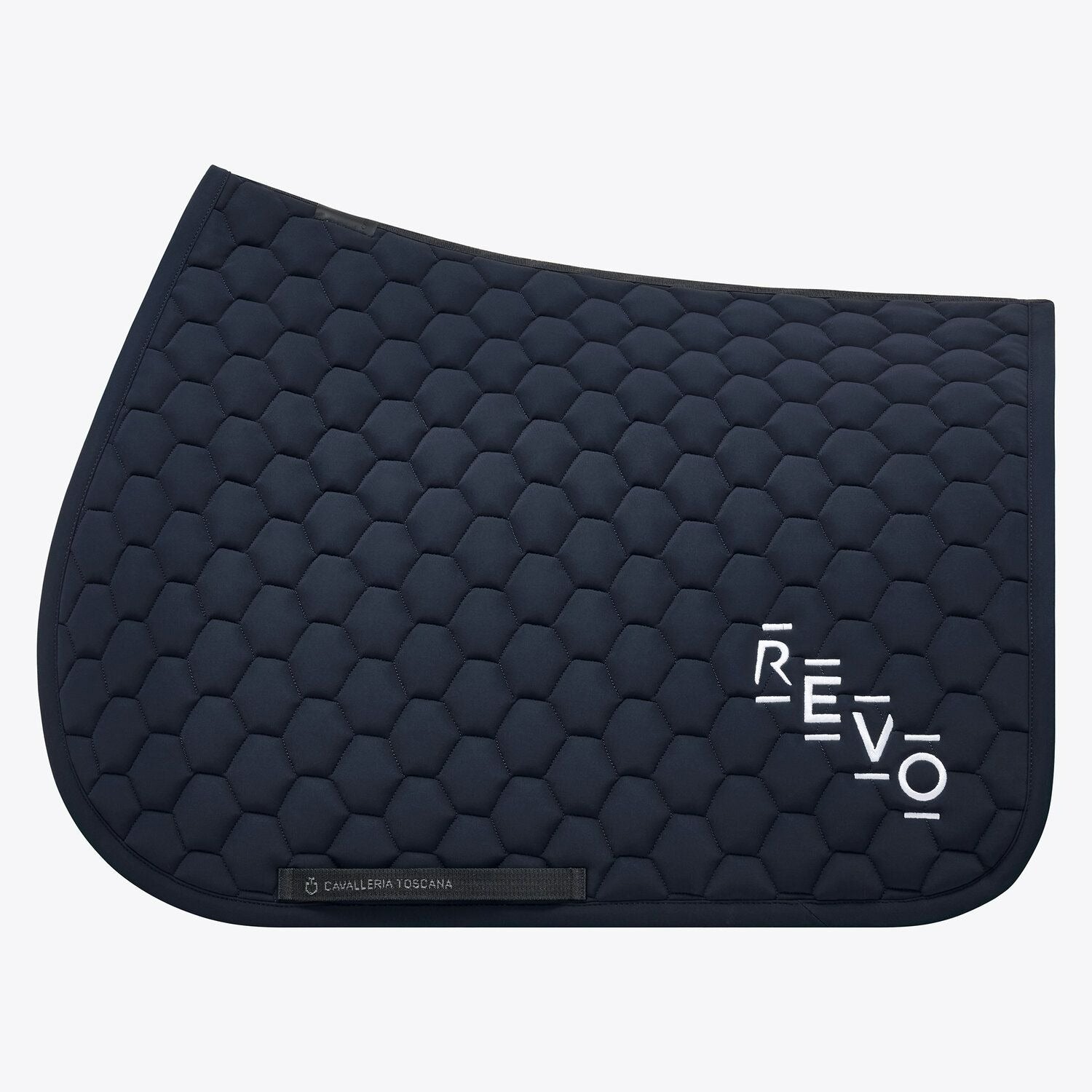 Jumping saddle pad with diamond quilting and a Cavalleria Toscana Team logo embroidered on the side. This accessory has an outer performance fabric face that’s lined in waffle texture cotton fabric on the inside.