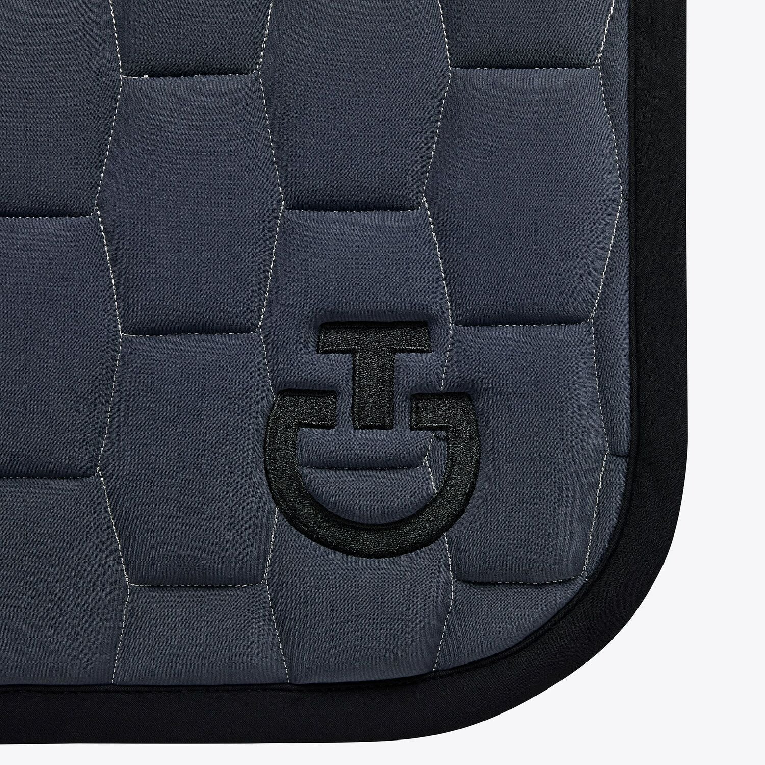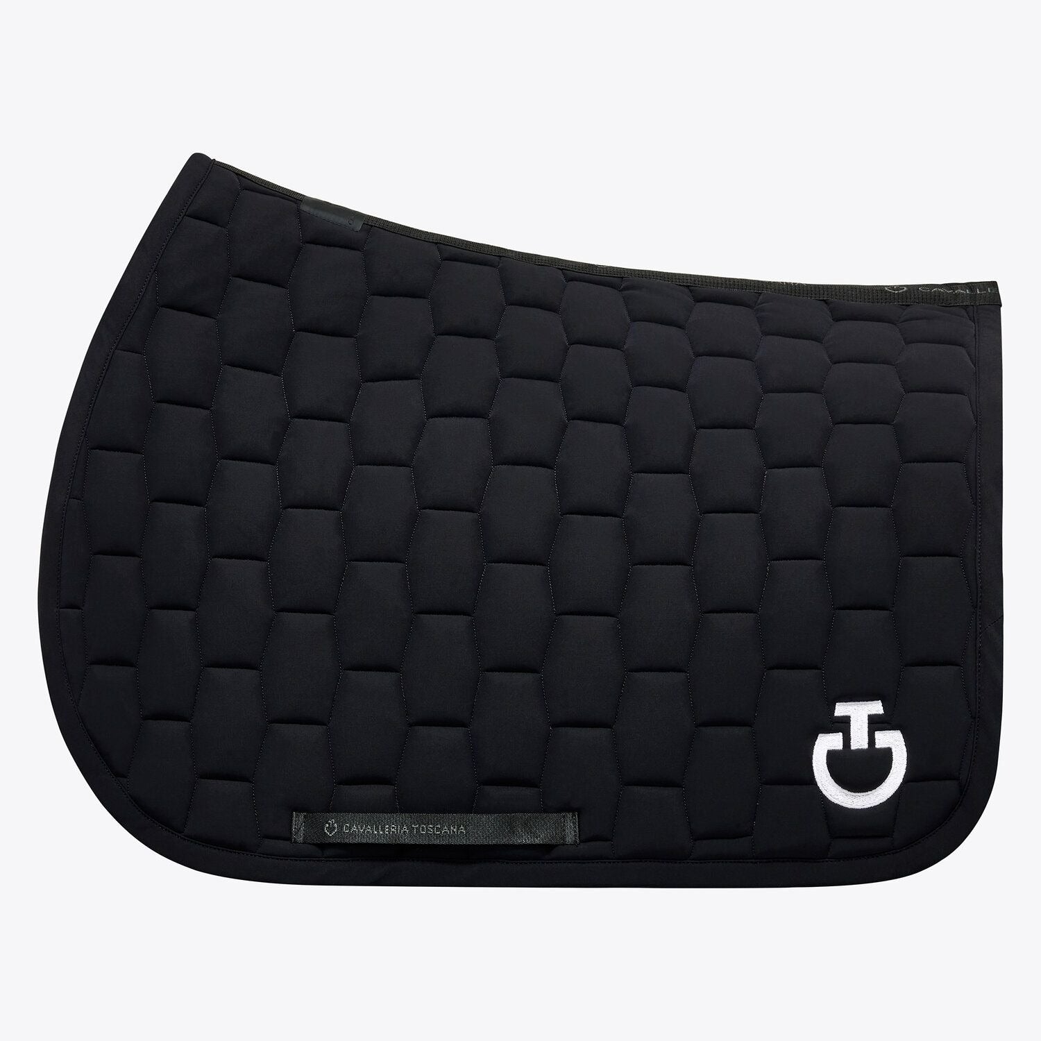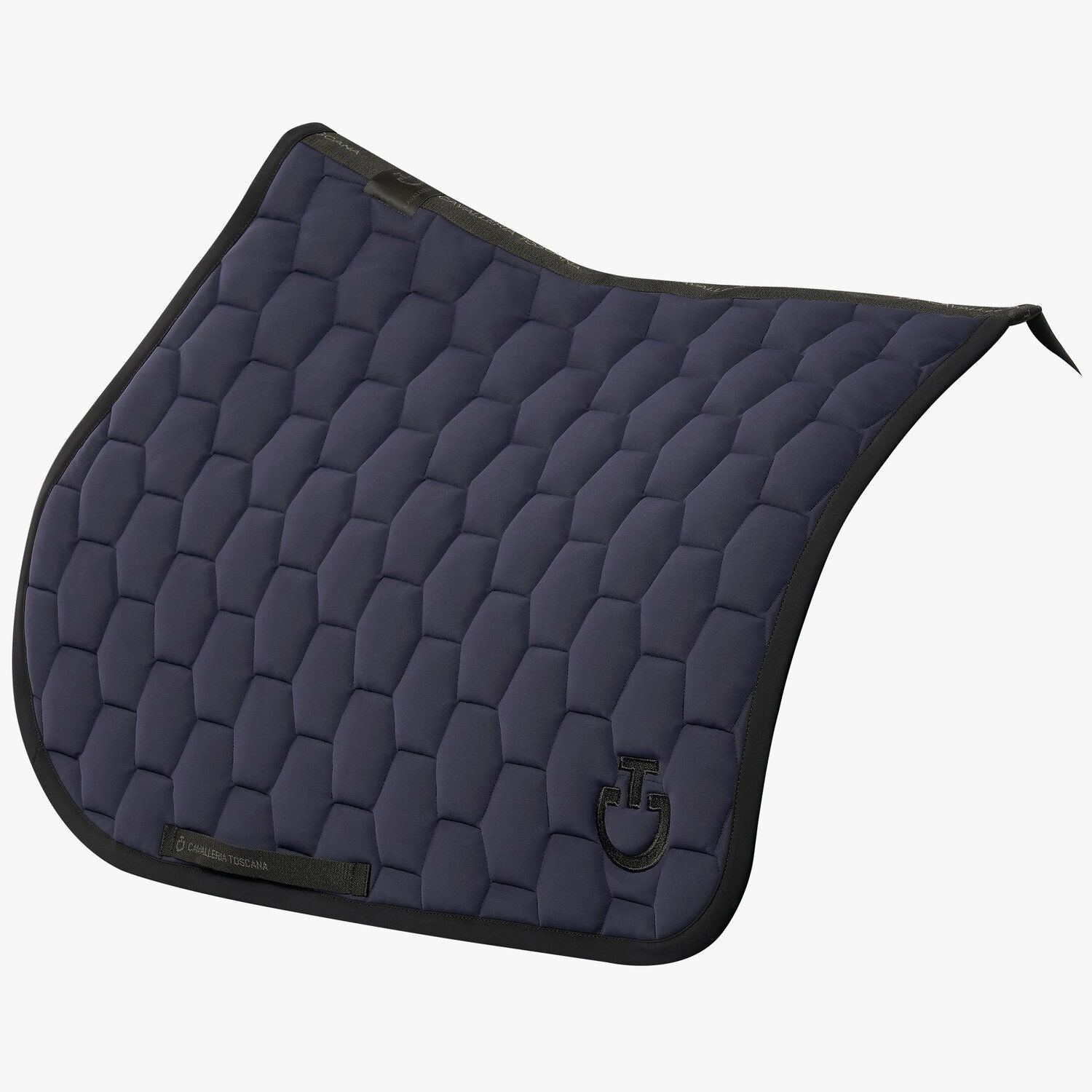 This Cavalleria Toscana jumping saddle pad combines refined aesthetics and practicality. The outer face in performance fabric is lined in a thin layer of padding and breathable, antibacterial waffle-texture cotton fabric. The robust construction ensures it holds up to multiple washes and lasts over time. Cut for an anatomical, close-contact fit that will suit any horse, details such as wave quilting, piping along the edges, and an embroidered logo add sophistication.