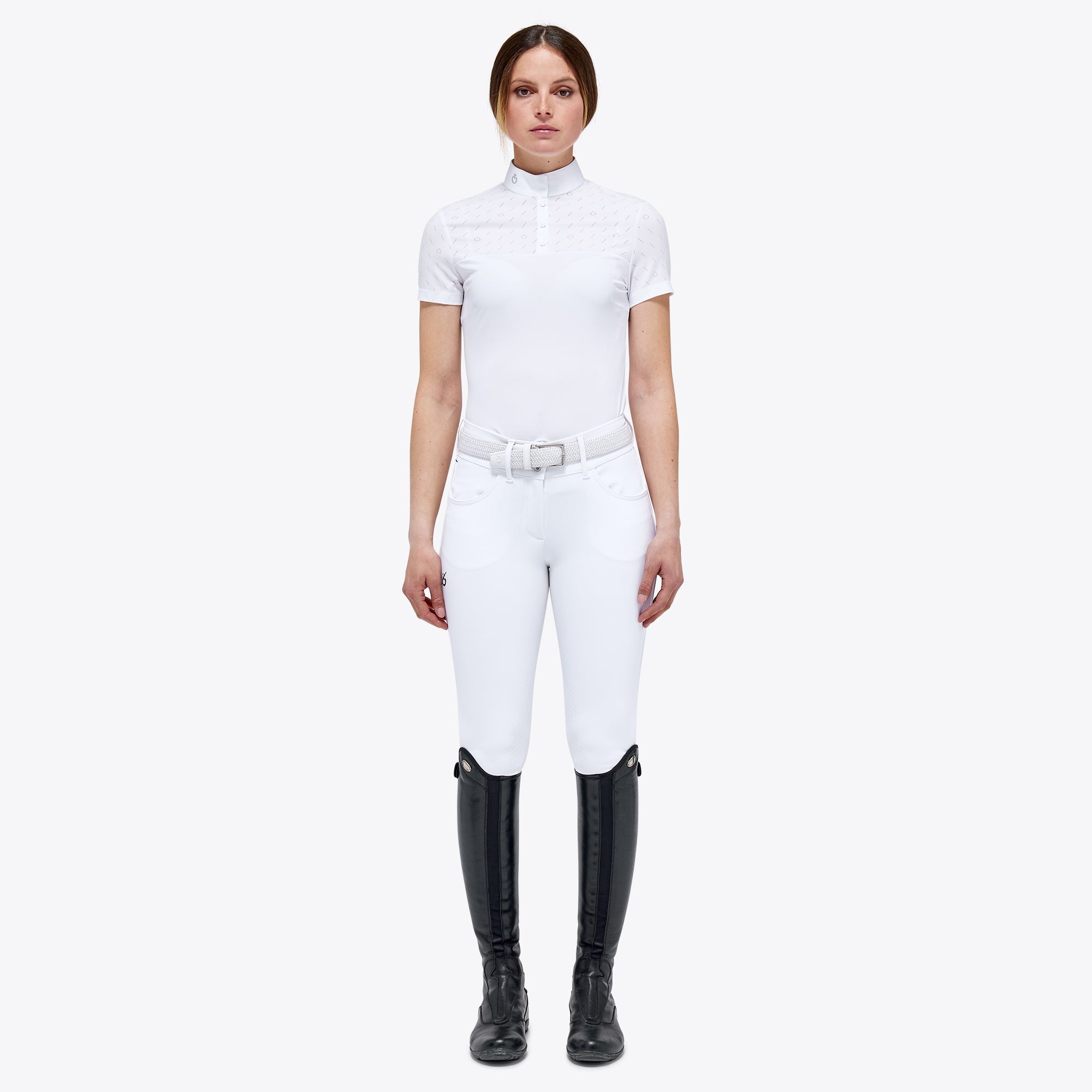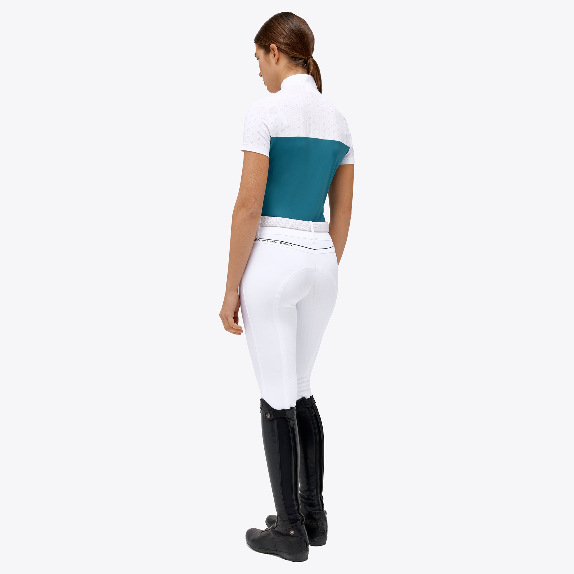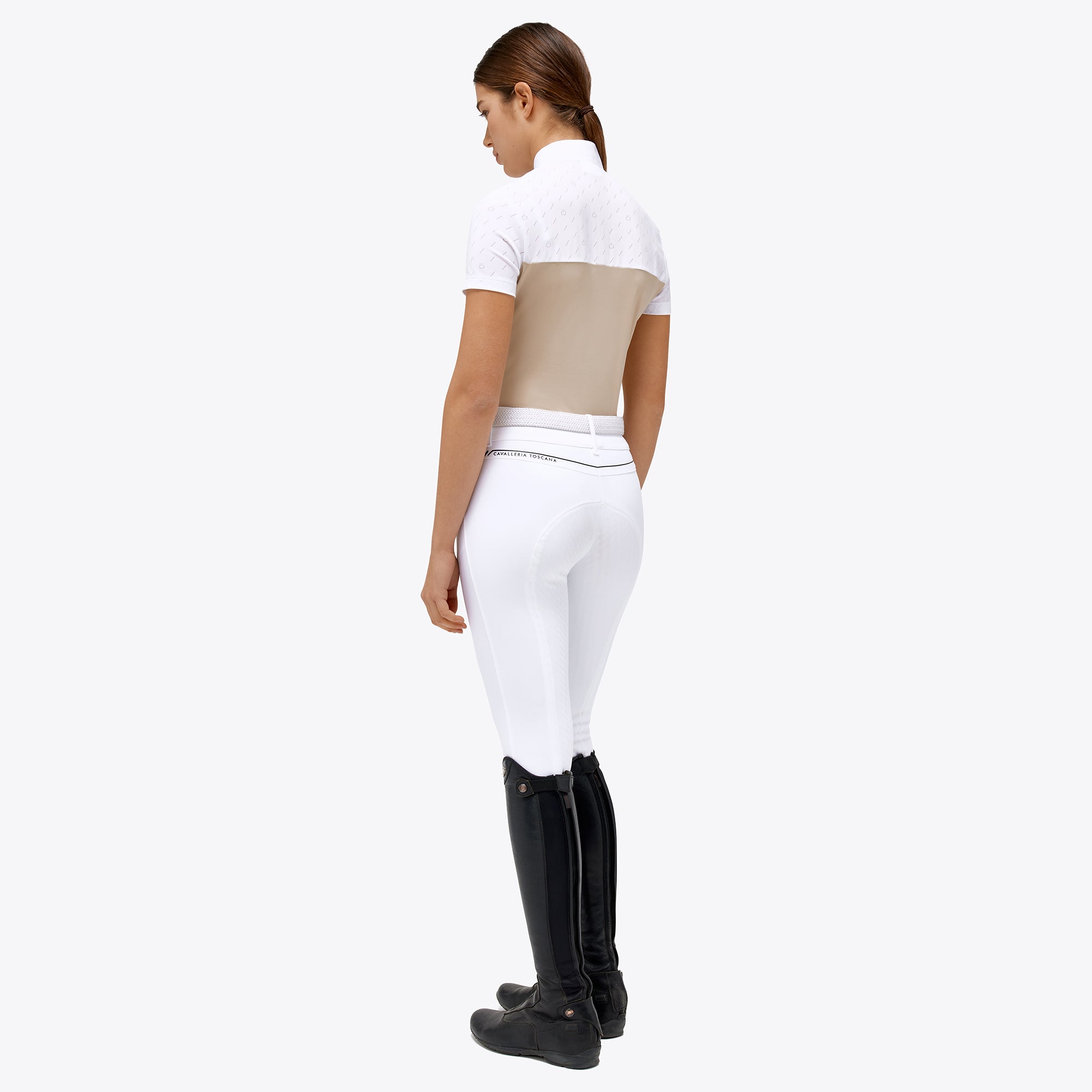 Designed for riding shows, this polo shirt represents Cavalleria Toscana’s heritage combined with functional, modern design. The model boasts a slim, feminine style that enhances the waist and is made of sumptuous cotton piqué that feels soft against the skin. The yoke and short sleeves are finished with tone-on-tone technical jersey and an all-over jacquard CT monogram. The button fastening and high collar with our iconic embroidery on the side complete the look.