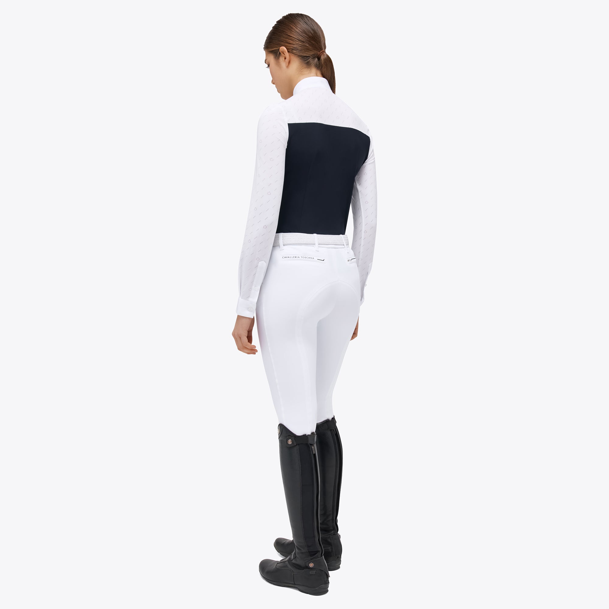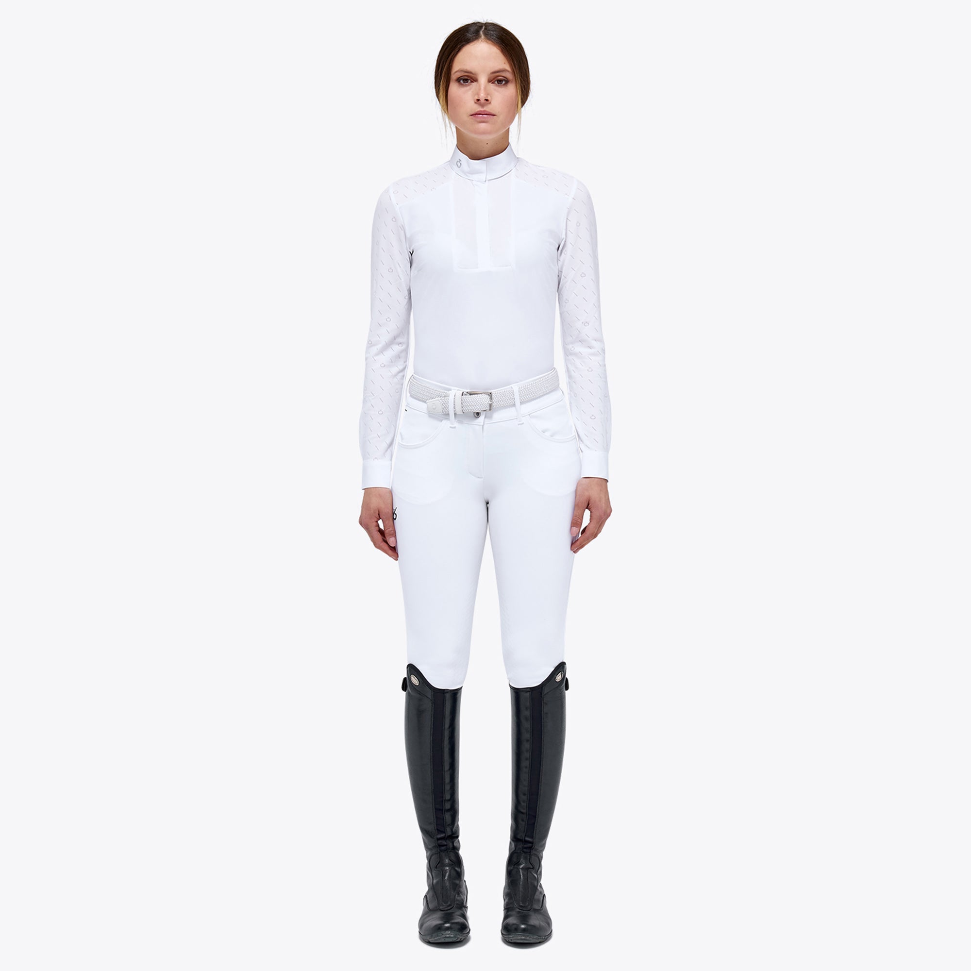 Designed both for riding competitions and with the aim to add an elegant touch to the wardrobe of contemporary female riders. The long sleeves and slim fit combine to elongate the figure and accent the waistline. In supple, breathable elasticated jersey, this shirt stretches in all four directions and is also crease-resistant. The style features a high neck with classic embroidery and jacquard CT monogram on the sleeves and back. The covered half placket echoes the clean lines of the garment.