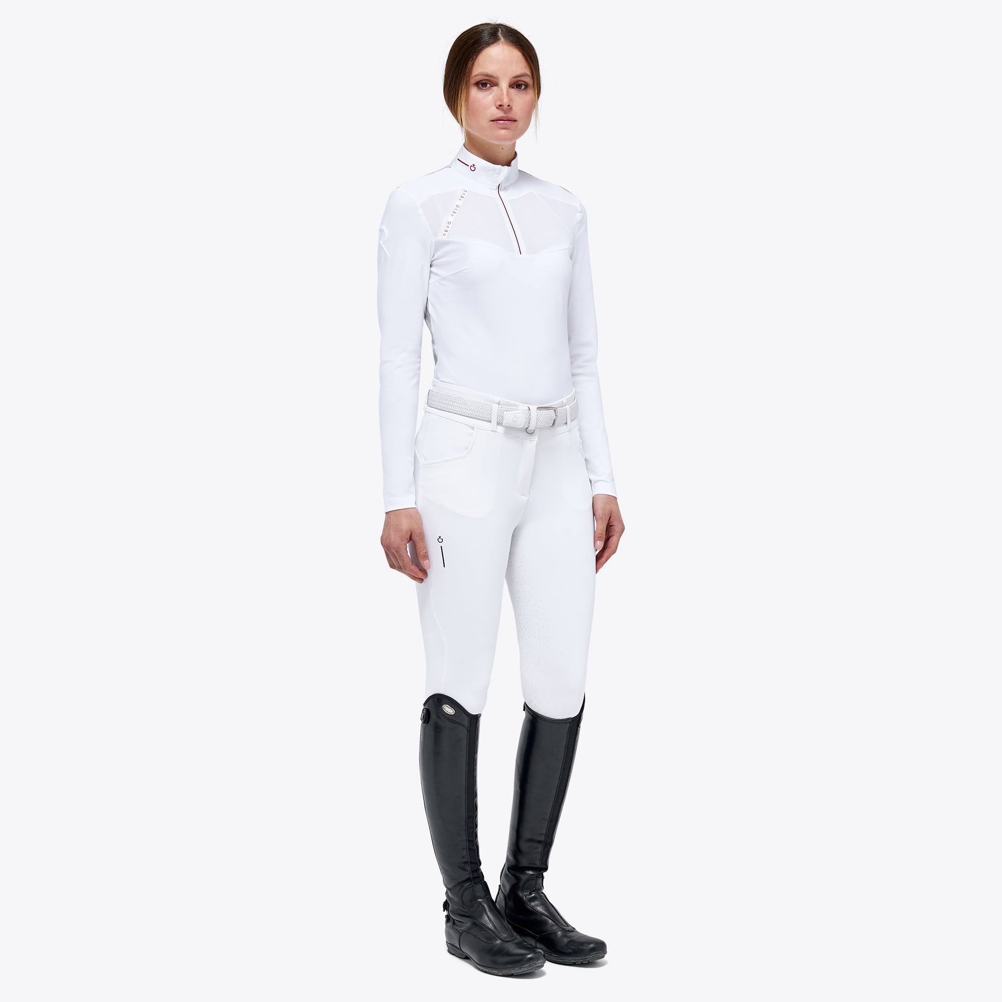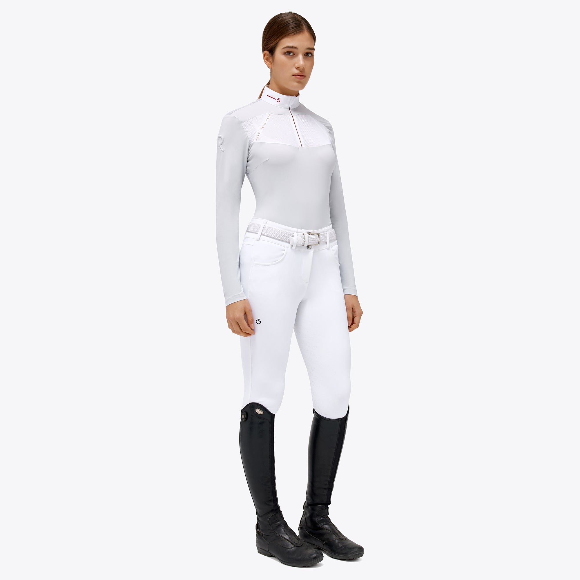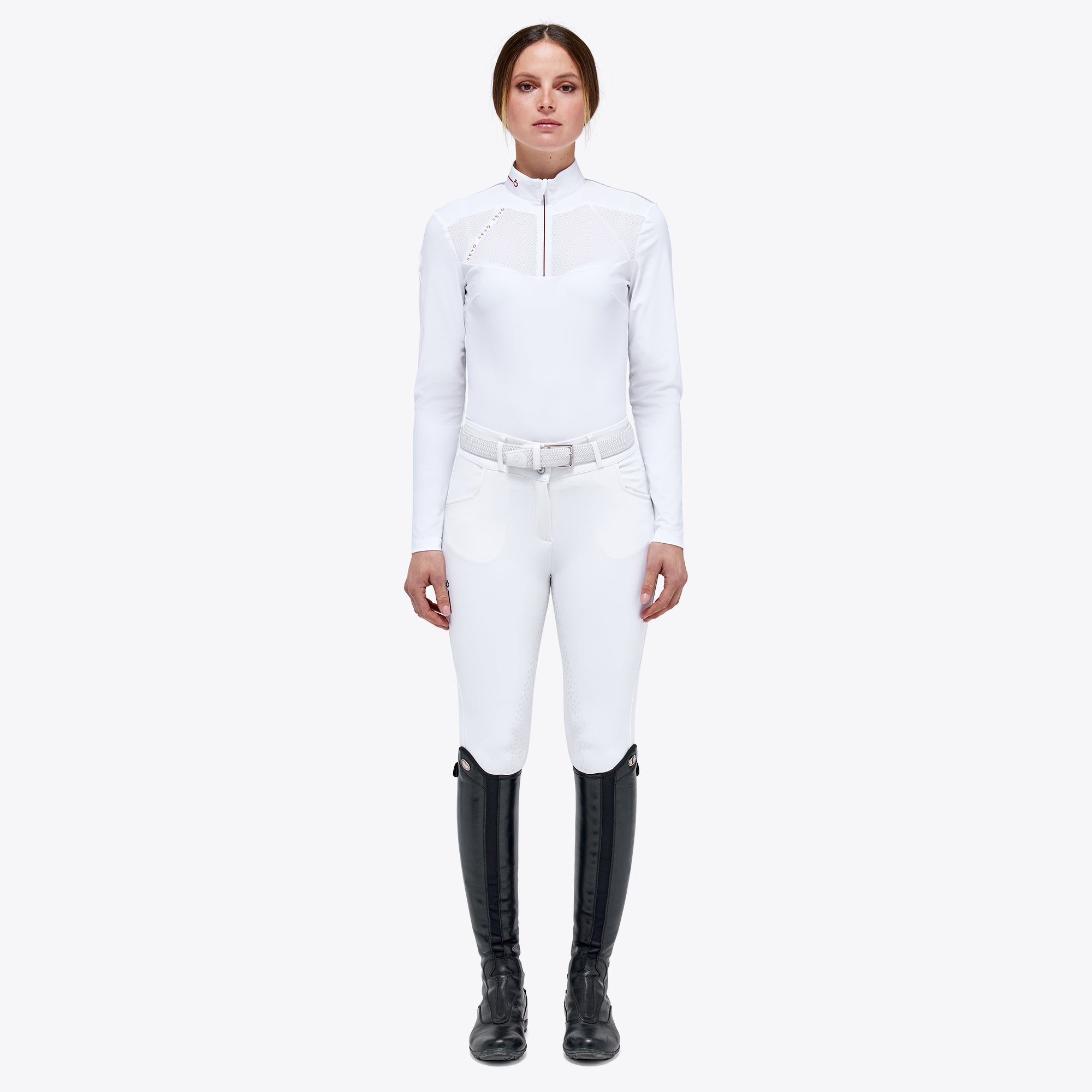 The Cavalleria Toscana polo shirt marks a clear upgrade in the wardrobe dedicated to equestrian shows. The model is made of extremely flexible and breathable REVO technical knit that absorbs perspiration, leaving the skin cool and dry at all times. The slim fit is finished with an embroidered high collar, a contrasting inlay decorating the bib and a quarter-zip fastening with a zip set in heat-activated seam tape for additional protection.