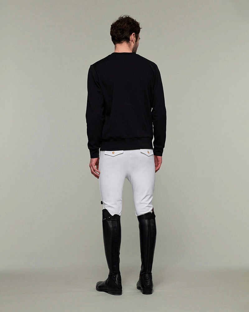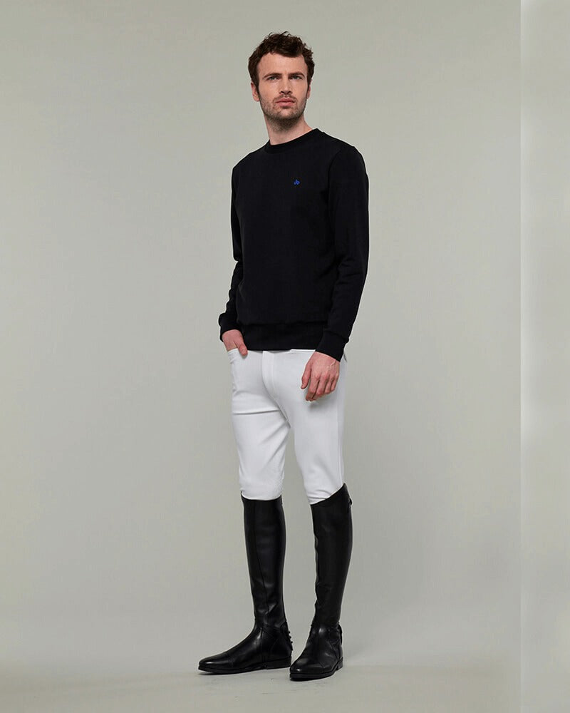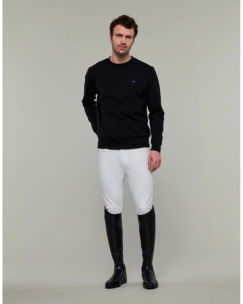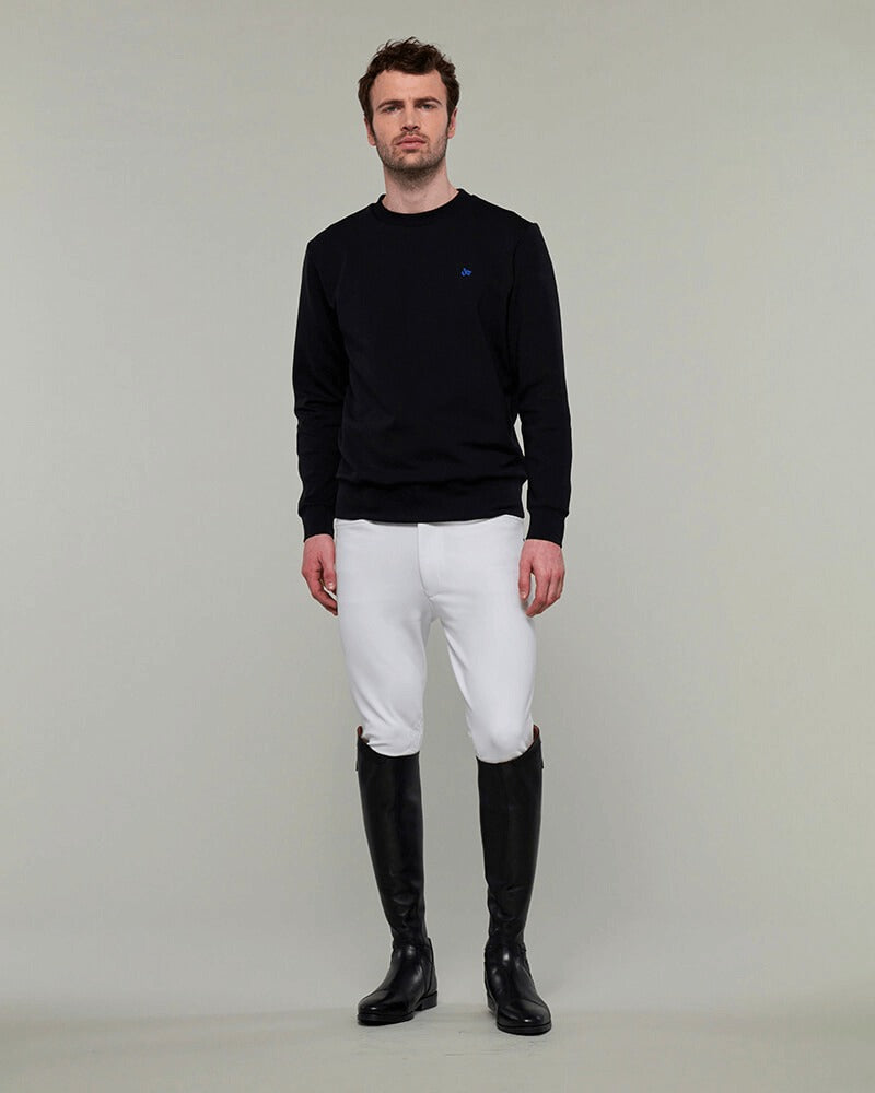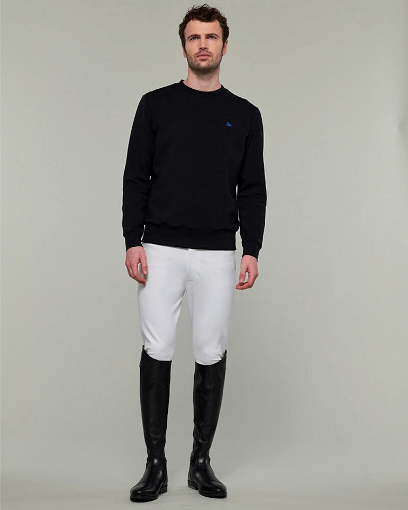 Comfortable piece with a sportswear look. Soft and windproof, the Alcazar sweater follows the rider's daily training to offer maximum comfort. It is available in black and forest.