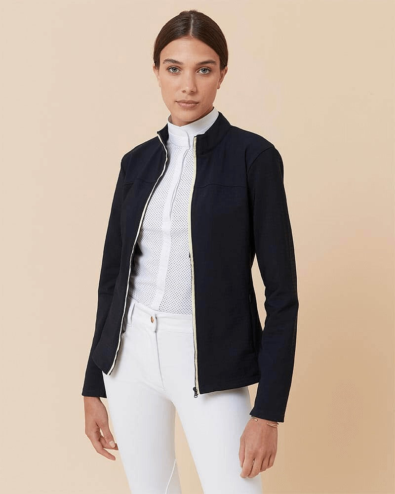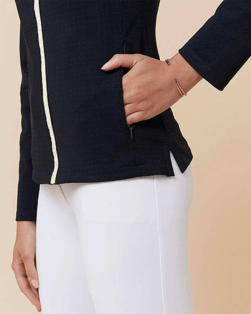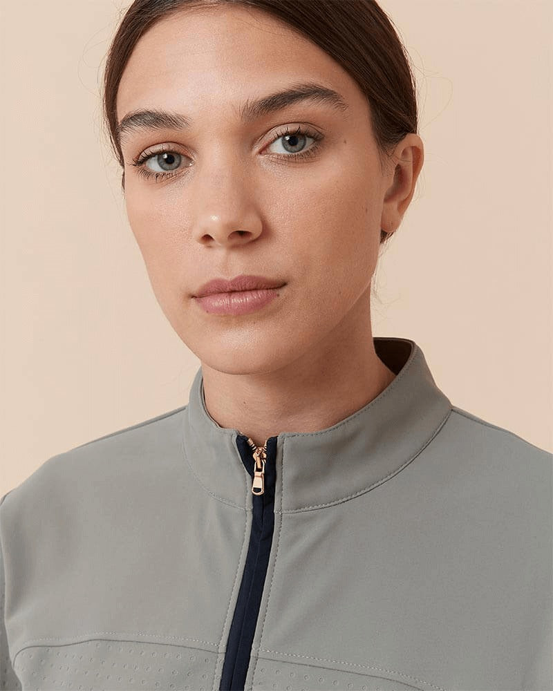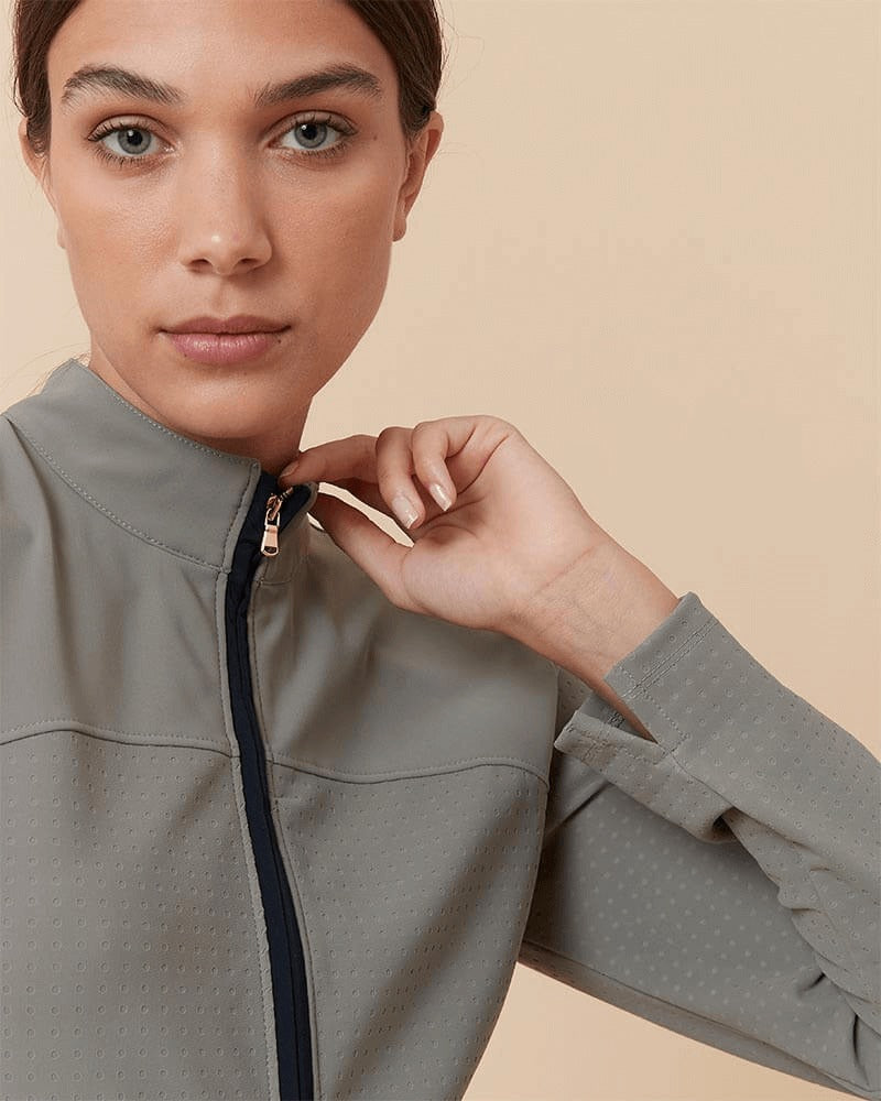 Lightweight, flowing technical training jacket with two invisible side pockets. Textured fabric, officer collar, shoulder yoke.