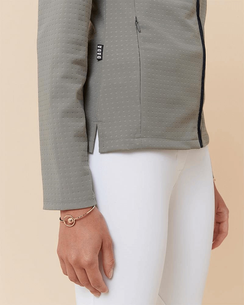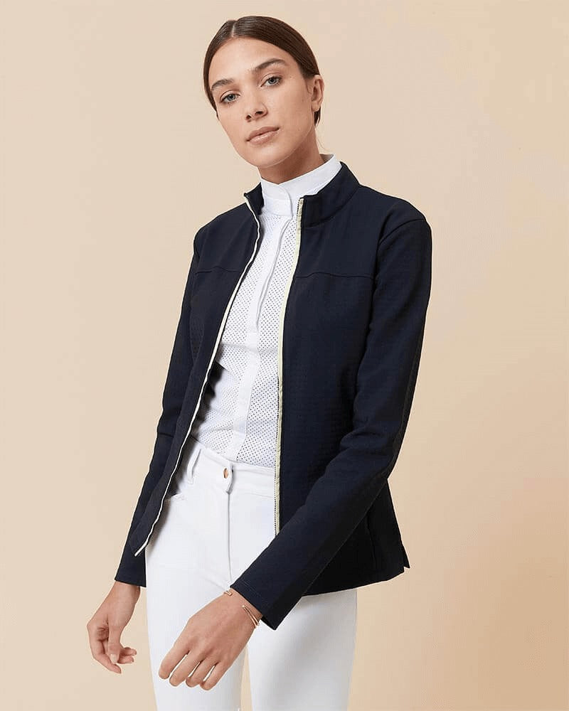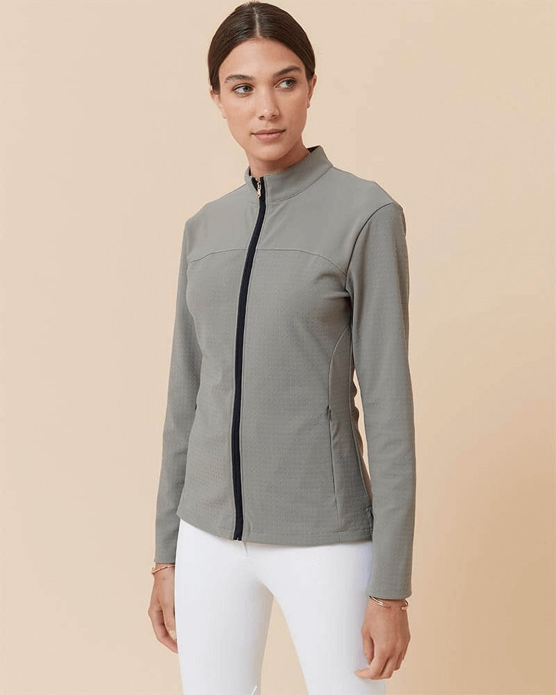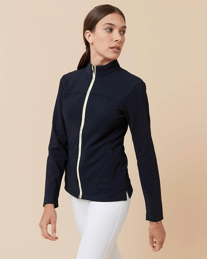 Lightweight, flowing technical training jacket with two invisible side pockets. Textured fabric, officer collar, shoulder yoke.