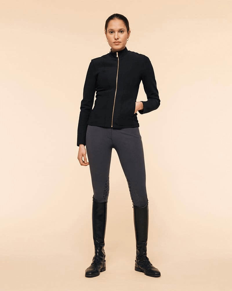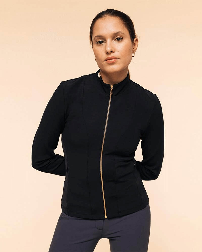 We imagined this training jacket with feminine cuts in the Dada Sport codes, we also decided to use softshell technology for maximum technicality. Its fabric scraped inside protects you from the cold while remaining breathable. It was also thought out in detail with the pull tab, inspired by a farrier's nail, on the light gold zipper, mesh inserts under the arms, and an officer's collar that transforms the silhouette and makes it a unique piece. Not to mention the signature DADA side label on the collar.