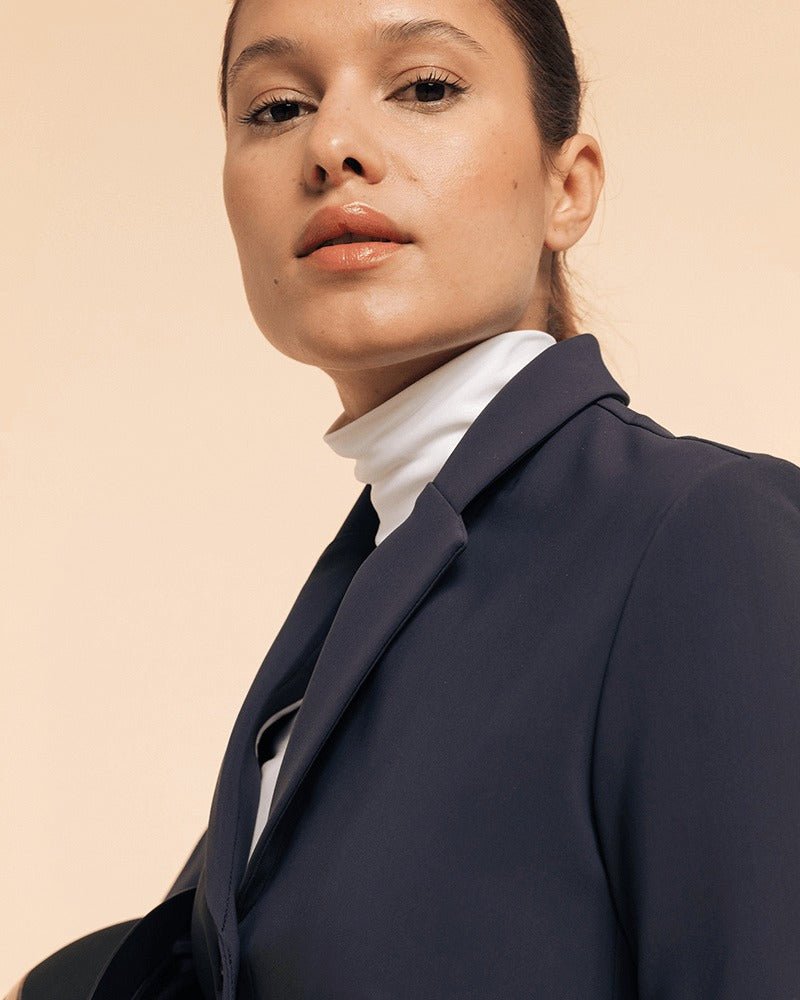 The Tzara competition jacket was developed as a tailor-made piece. It is identified by its blazer collar, its princess cut-outs on the front and back, 2 false pockets with simple piping, its 3 logo buttons on the front and its 4 buttons on each wrist. Tzara is also very breathable thanks to its mesh inserts under the arms.