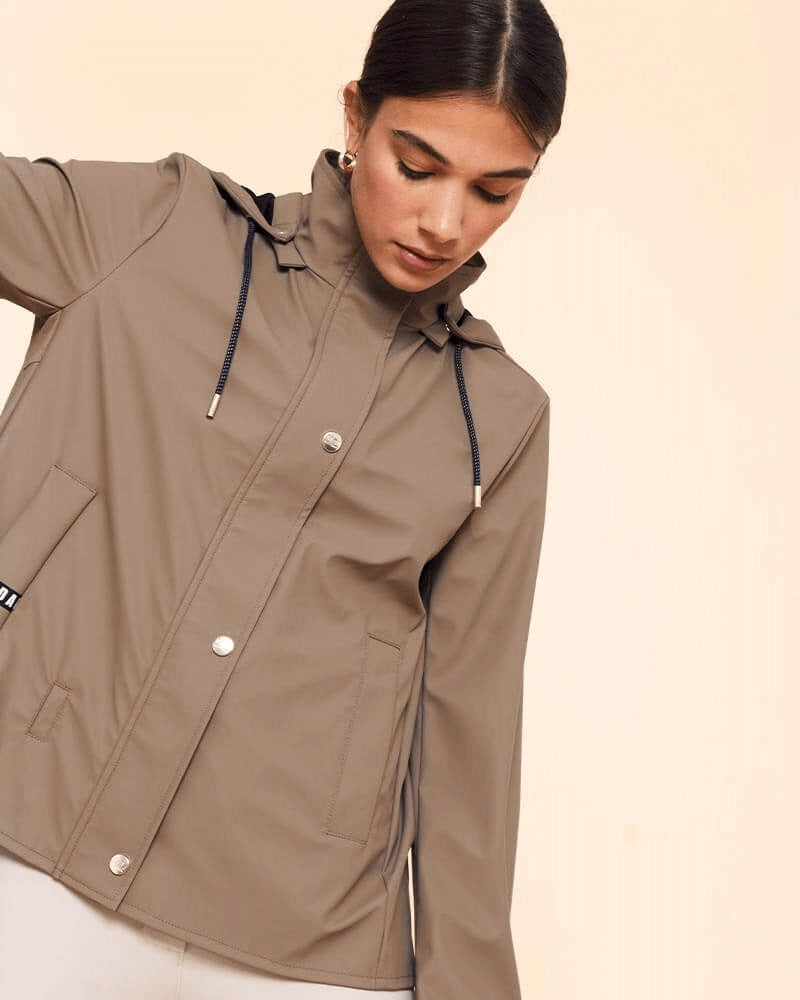 The removable hood is fixed by invisible snaps. It can be tightened by a drawstring whose ends are finished by a golden tip.