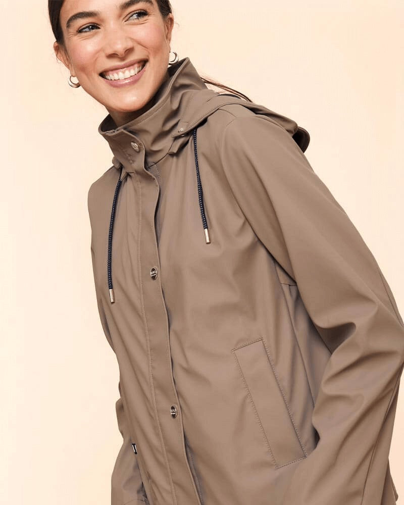 Trapeze shape, removable hood. The fabric is waterproof. Mesh underarm yoke for better breathability.