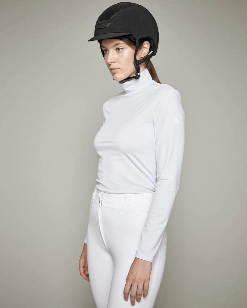 Introducing the Visconti, a long-sleeved technical T-shirt featuring a distinctive chimney collar. Its tailored, slim-fitting cut, coupled with tulle underarm inserts, makes it an indispensable addition to the modern rider's wardrobe.