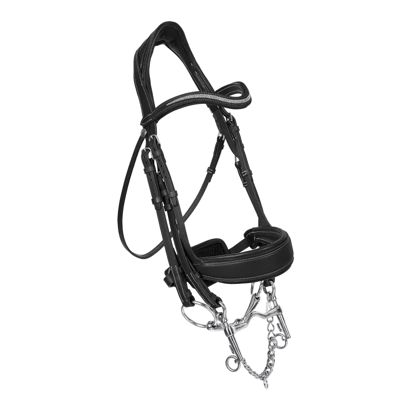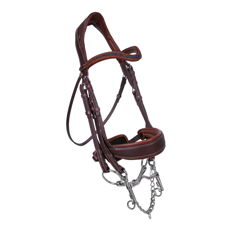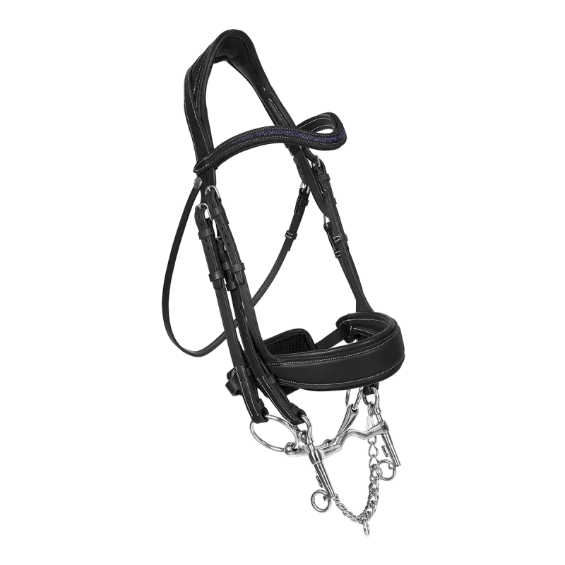 The Crystal Makila full bridle has a broad, ergonomic headpiece integrating all cheek piece components to make your horse more comfortable. The headpiece boasts an opening at the nape to free the nuchal ligament. The browband features elastic loops that make contact with the temporal bone, minimizing pressure while also improving the accuracy of its position. The articulated throat latch and noseband can be adjusted from both sides to effortlessly achieve perfect balance and fit. The broad noseband features an opening at the corner of the mouth for optimal use of the snaffle bit. It is also equipped with a broad, thick flash that perfectly supports the lower jaw.