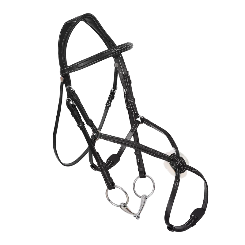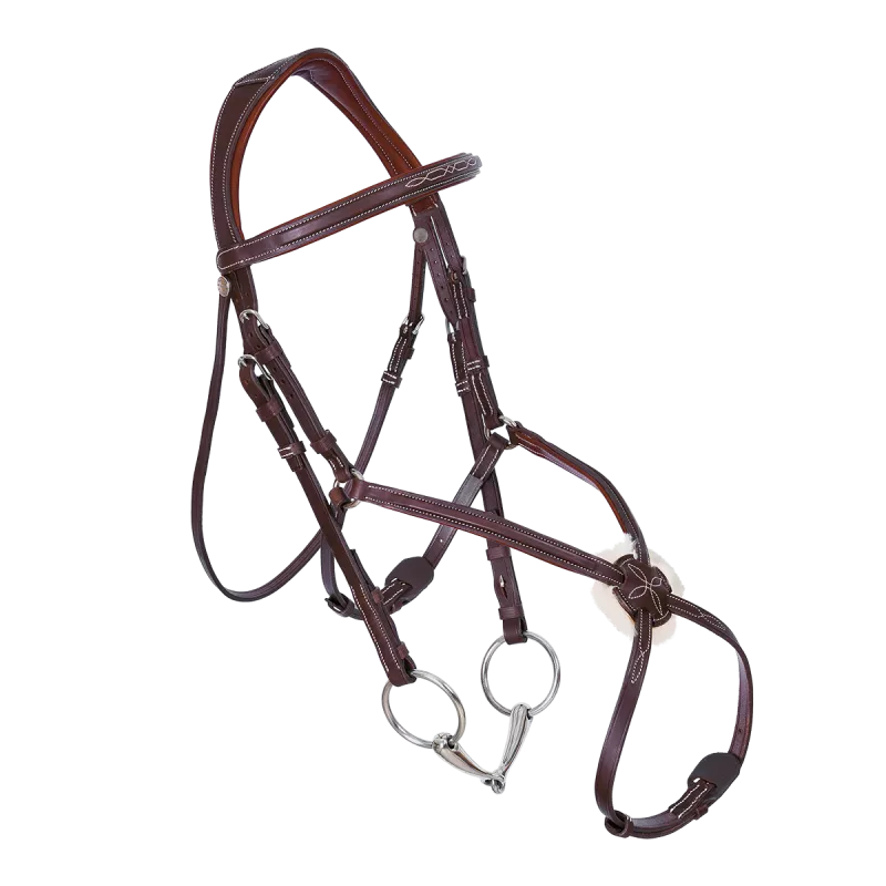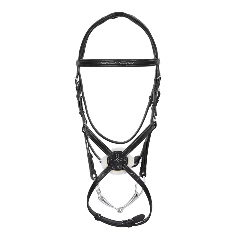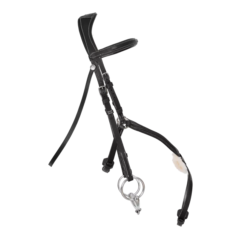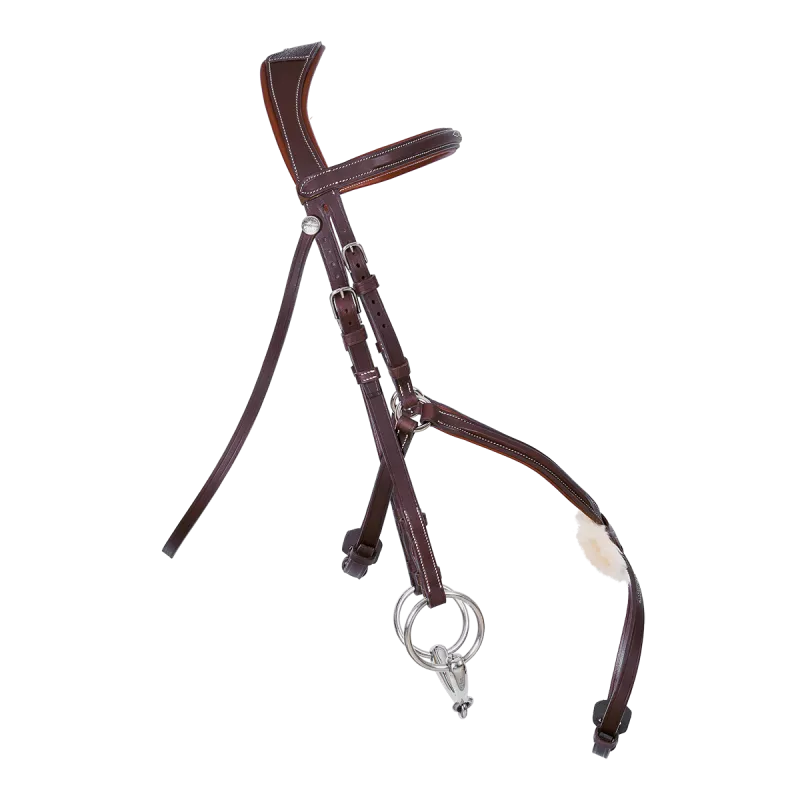 The figure 8 noseband snaffle bridle features a thin, ergonomic, calfskin-lined headpiece for the horse’s comfort. The headpiece includes an opening at the nape to free the nuchal ligament. The browband features elastic loops that make contact with the temporal bone, minimizing pressure while also improving the accuracy of its position. The finishing touches, including cheek pieces with clasps and a delicately over-stitched, rounded noseband make for a very elegant snaffle bridle. The articulated throatlash offers double adjustment, just like the crossed noseband at the jaw and chin.