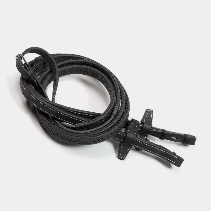 The rubber Hunter reins are made of 20mm wide rubber hands with large pimple grips. The out-hand part of the reins is made of curved and stitched leather. The reins are equipped with martingale loops and are hook mounted.