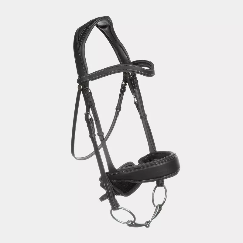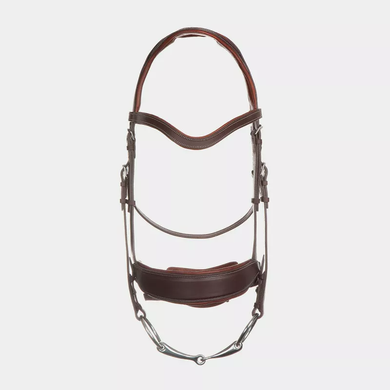 The Makila bridle has a broad, ergonomic headpiece integrating all cheek piece components to make your horse more comfortable. This headpiece boasts an opening at the nape to free the nuchal ligament. The browband features elastic loops that make contact with the temporal bone, minimizing pressure while also improving the accuracy of its position. The articulated throatlash and noseband can be adjusted from both sides to effortlessly achieve perfect balance and fit. The broad noseband features an opening at the corner of the mouth for optimal use of the snaffle bit. It is also equipped with a broad, thick flash that perfectly supports the lower jaw.