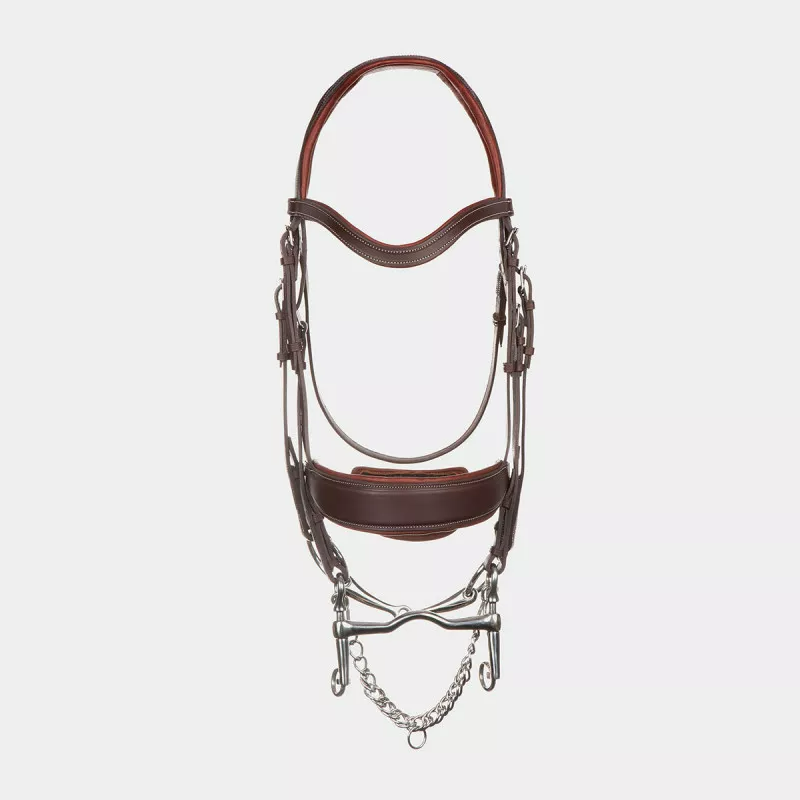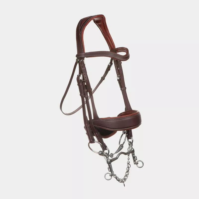 The Makila full bridle has a broad, ergonomic headpiece integrating all cheek piece components to make your horse more comfortable. The headpiece boasts an opening at the nape to free the nuchal ligament. The browband features elastic loops that make contact with the temporal bone, minimizing pressure while also improving the accuracy of its position. The articulated throatlash and noseband can be adjusted from both sides to effortlessly achieve perfect balance and fit. The broad noseband features an opening at the corner of the mouth for optimal use of the bit. It is also equipped with a broad, thick flash that perfectly supports the lower jaw.