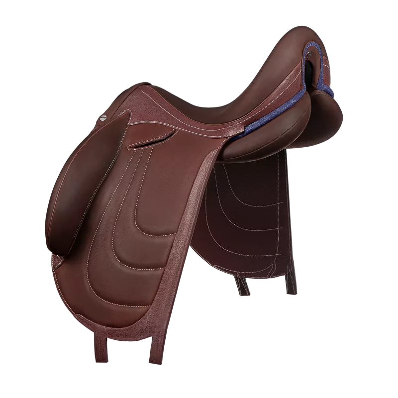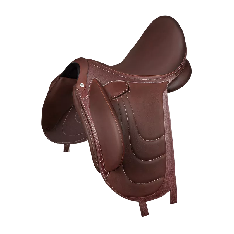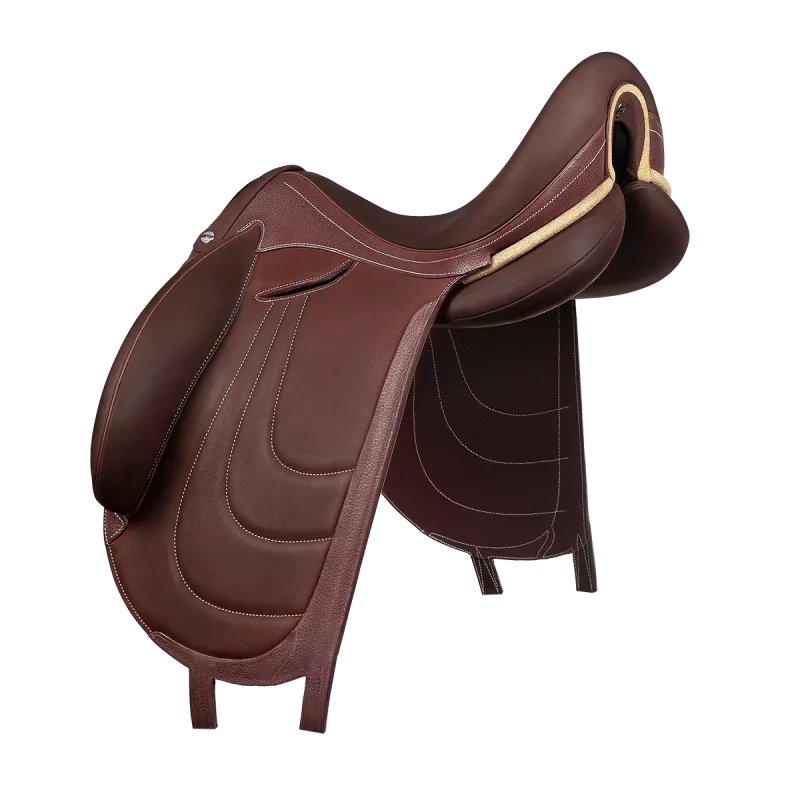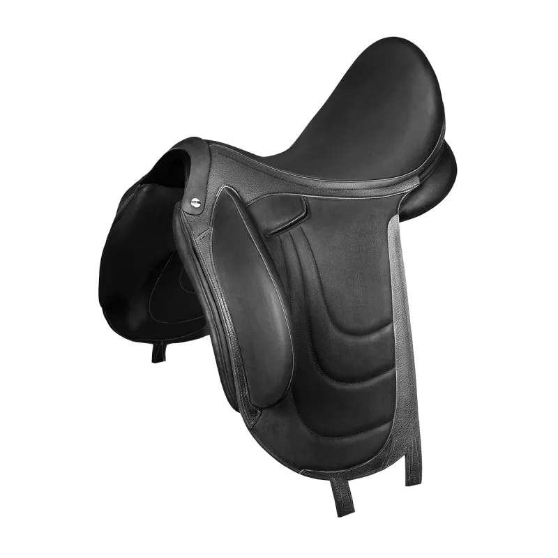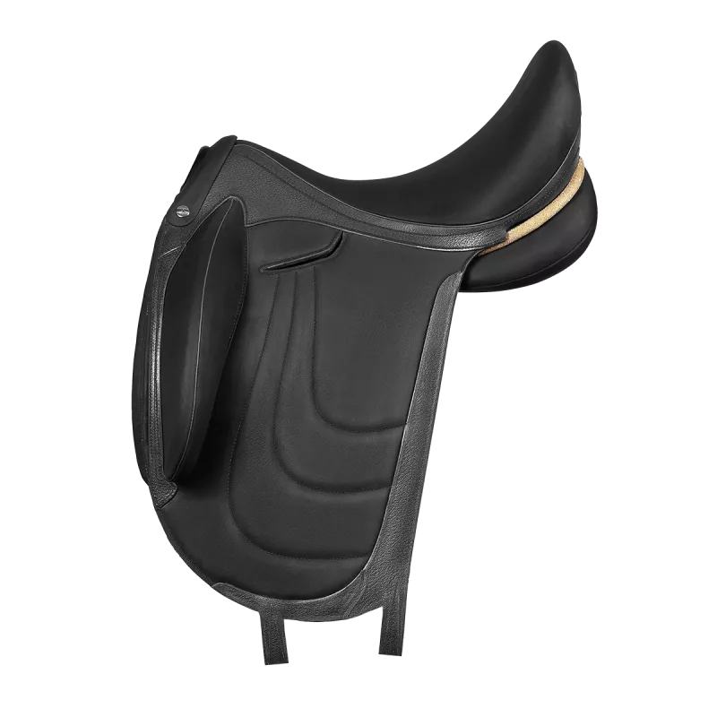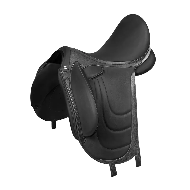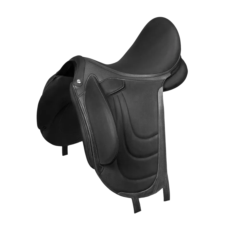 The Makila Harmonie S is a single-flap, deep-seated dressage saddle with a slender twist which helps the pelvis engage and makes opening the leg easier. This saddle has been created for the most demanding dressage riders, allowing them to experience close contact with their horses. Since the harness is equipped with a Dynamick® dressage tree which provides freedom of movement and allows pressure to be spread evenly on your horse’s back, it will give you lightness and flexibility when you perform dressage movements. In addition, its single flaps provide the rider with perfect stability and exact leg contact. Its pre-formed, attached flaps, knee and thigh blocks, and padding provide optimal comfort and improved communication between you and your horse. Its wide and well-defined gullet leaves your horse’s back unencumbered and provides additional comfort when performing dressage movements. Lastly, its wide, D3D panels allow pressure to be spread more evenly on your horse’s back (+30% load-bearing capacity). Use this saddle for dressage or on the flat—registered model.