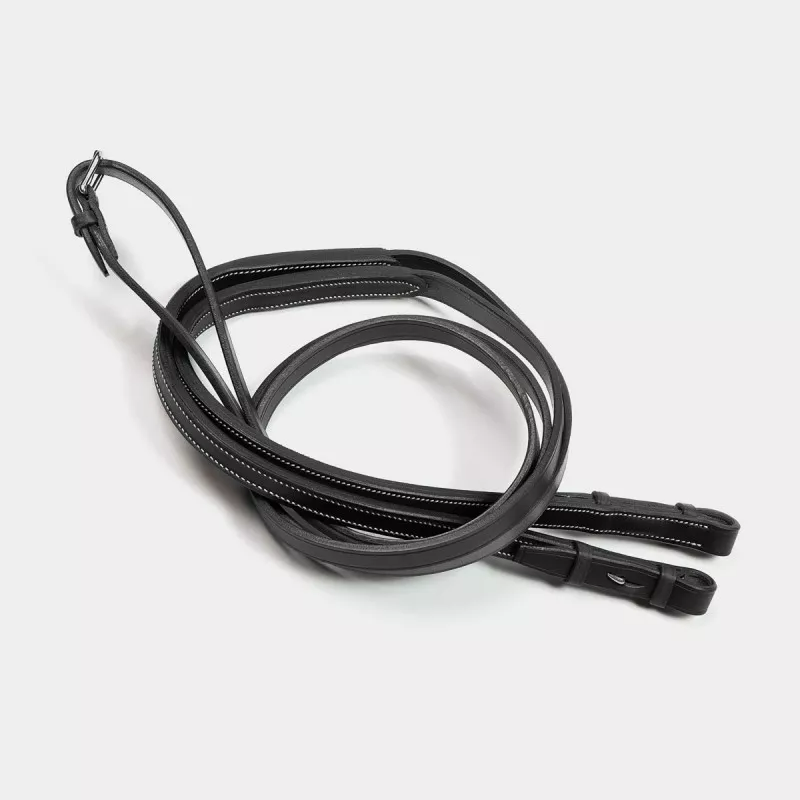 These smooth leather Makila reins are made of a single piece of leather especially selected for its strength. Both reins are connected by a loop and are 16mm wide. They are equipped with hook mounting.