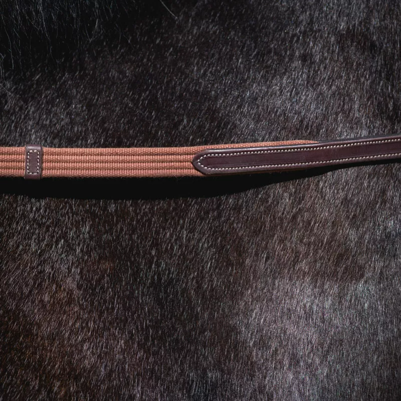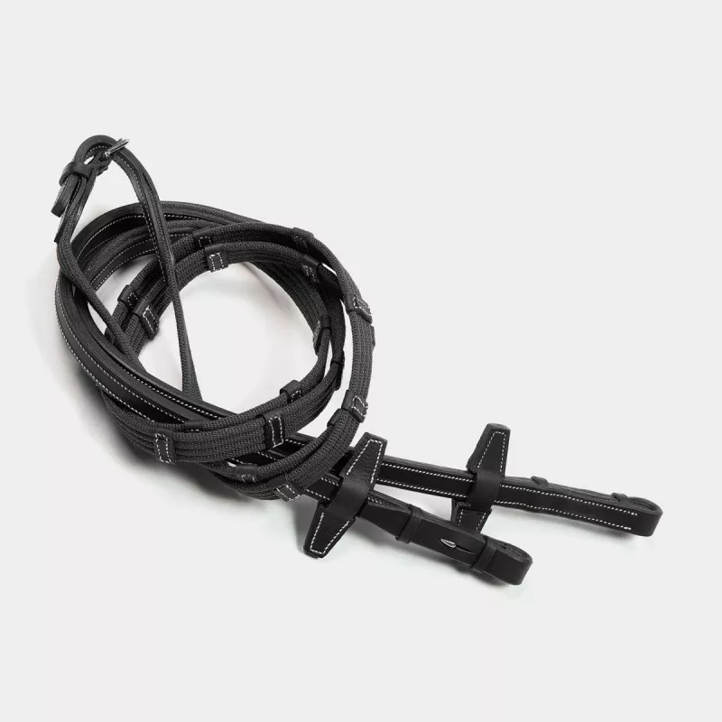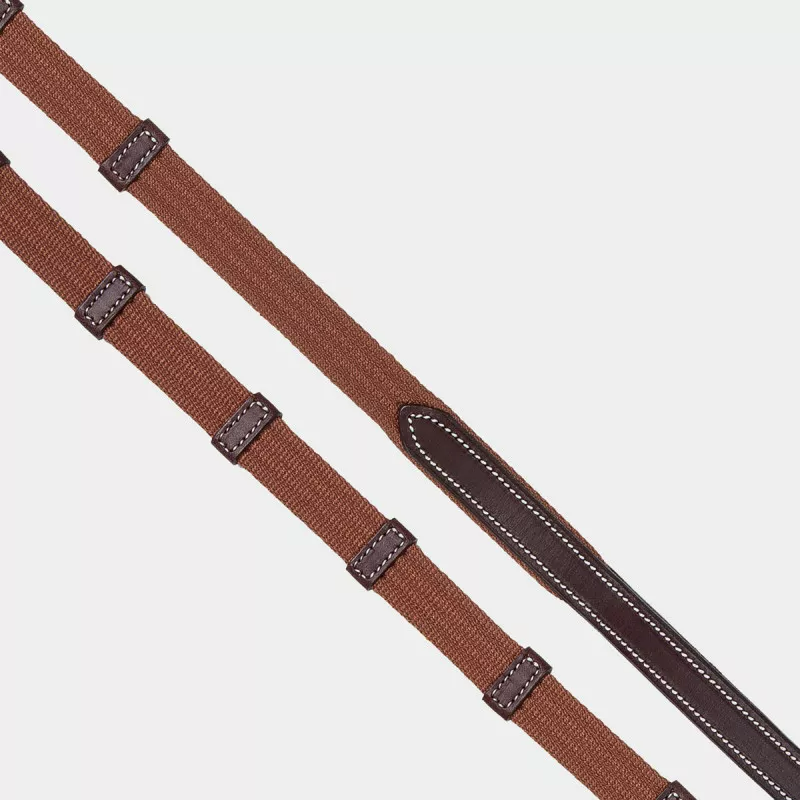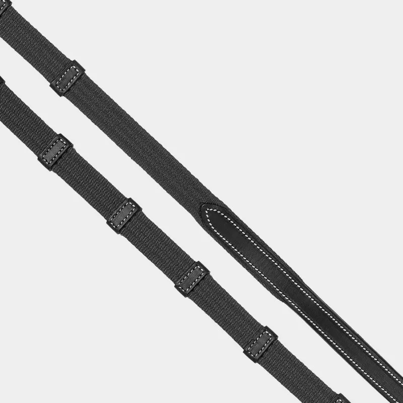 The web reins feature a canvas grips. The leather loops along the length allow a better grip in the hand. The out-hand part of the reins is made out of curved and stitched leather. They are equipped with martingale loops and are mounted on hooks.