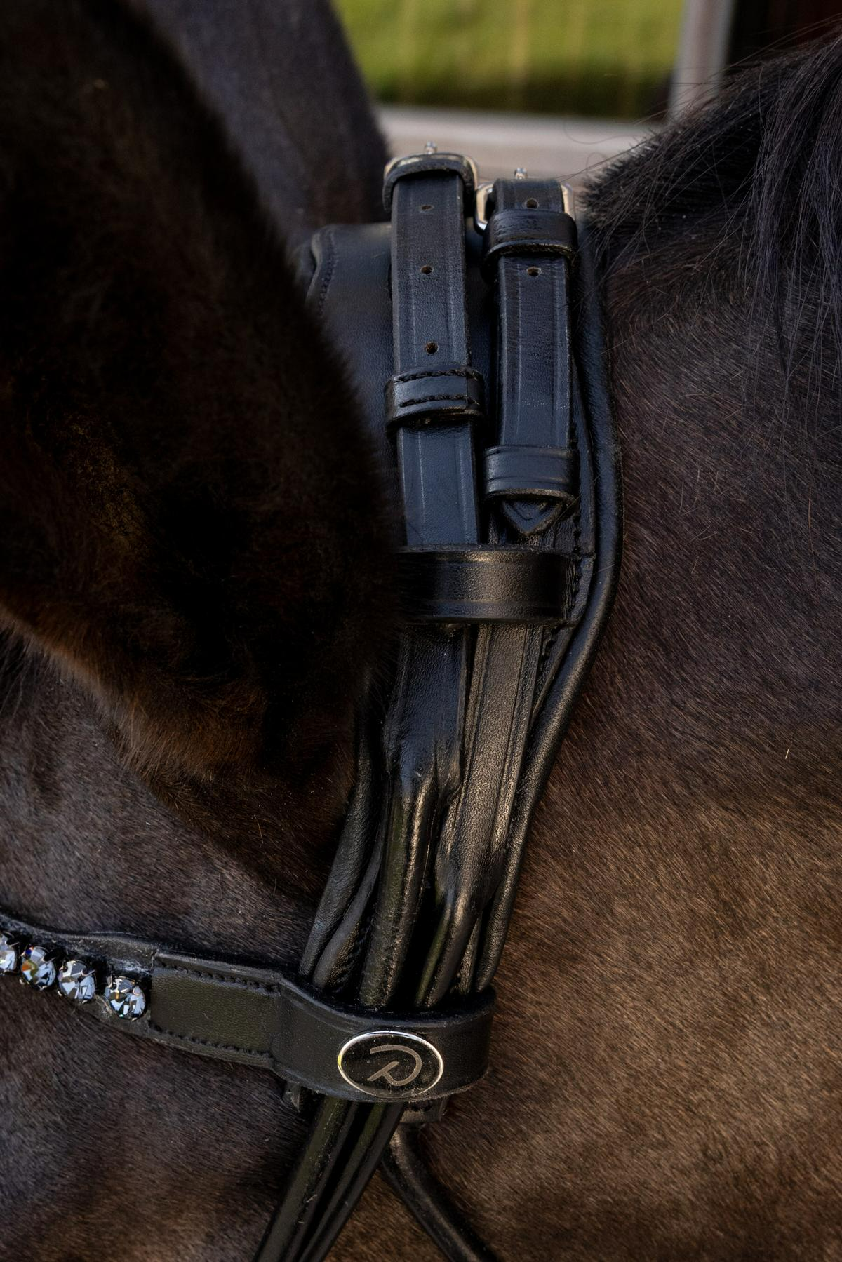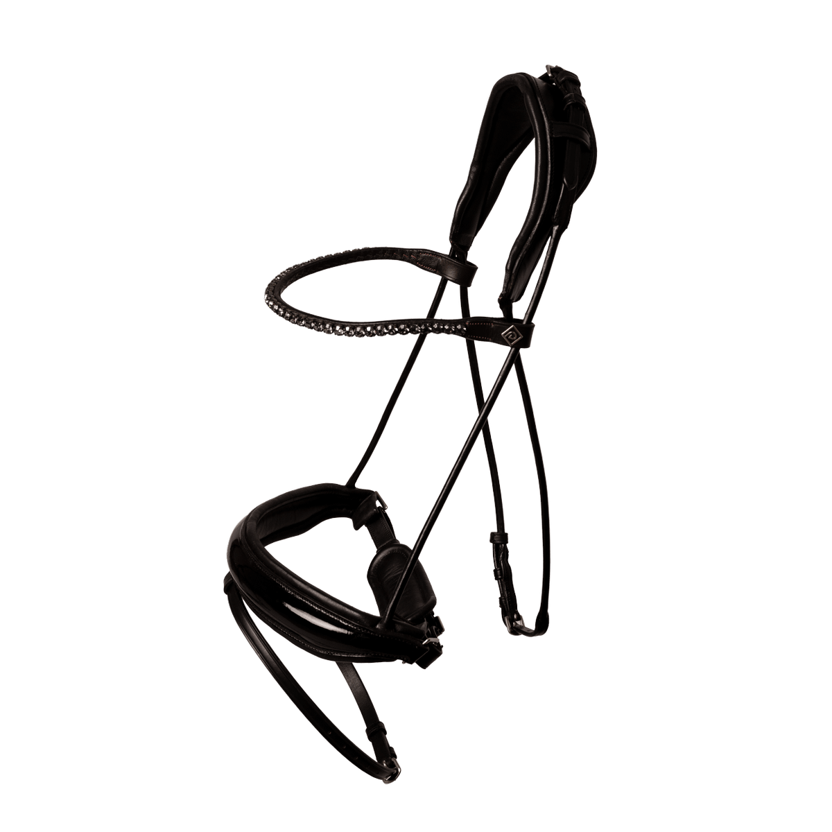 Top-mounted adjustments allow for fine-tuned fitting in the poll and neck area—an essential detail for horses that tend to resist pressure at the poll. The headpiece is shaped to follow the contour of the ears, relieving tension and avoiding common pressure points. Combined with the wide padded crank noseband and supple rolled leather, the bridle ensures even contact and flexibility without compromise.