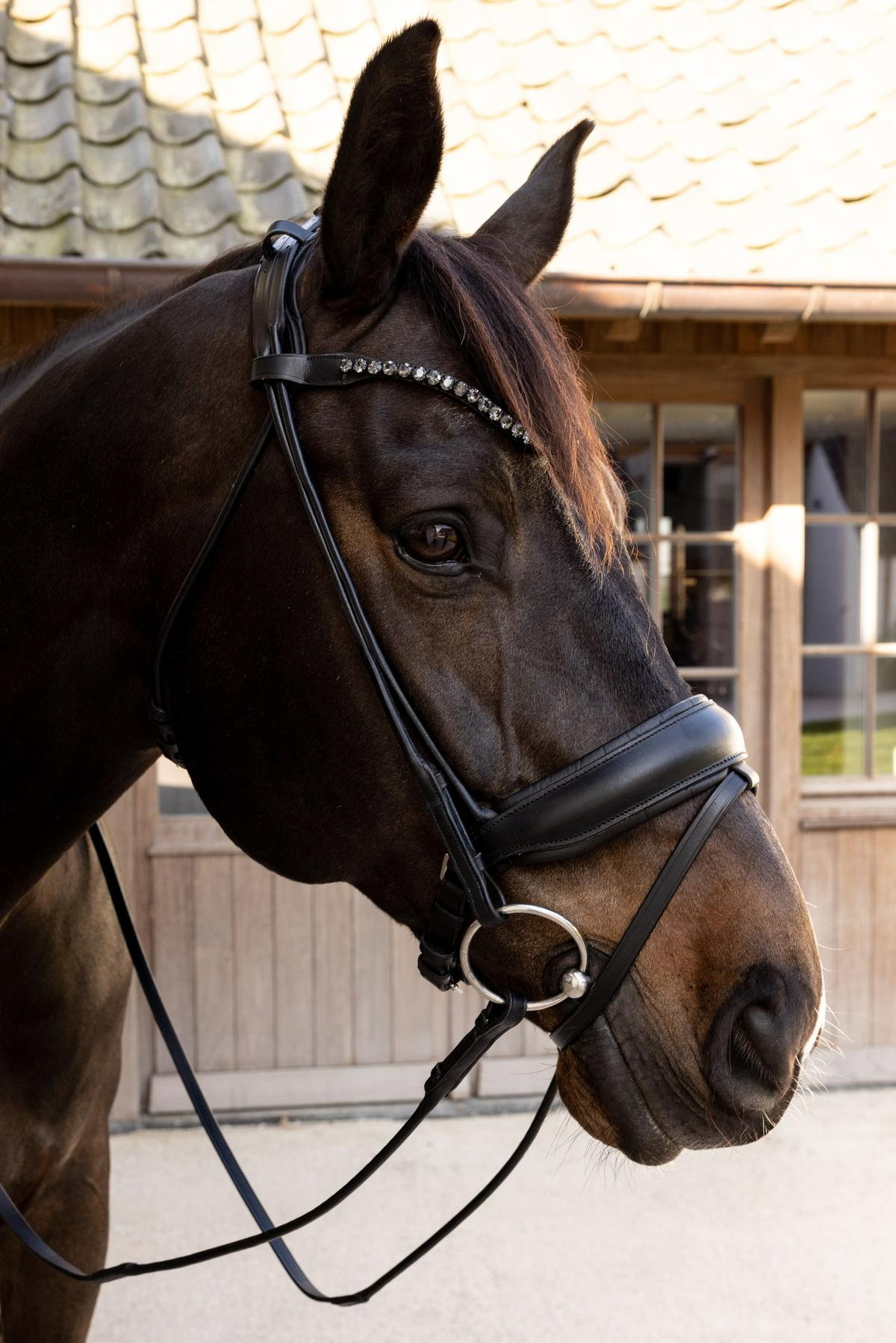 The Comfohead Bridle combines advanced ergonomic design with understated elegance. The anatomic headpiece, softly padded and curved to avoid pressure behind the ears, offers superior comfort—especially for sensitive horses. Thanks to the rolled leather design, this bridle brings flexibility and finesse, while maintaining durability. The crank noseband, wider and padded, provides a more comfortable contact surface, distributing pressure without compromising control. The crystal browband adds just the right amount of shine, making it a favorite among riders who love both function and finesse.