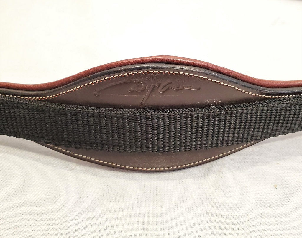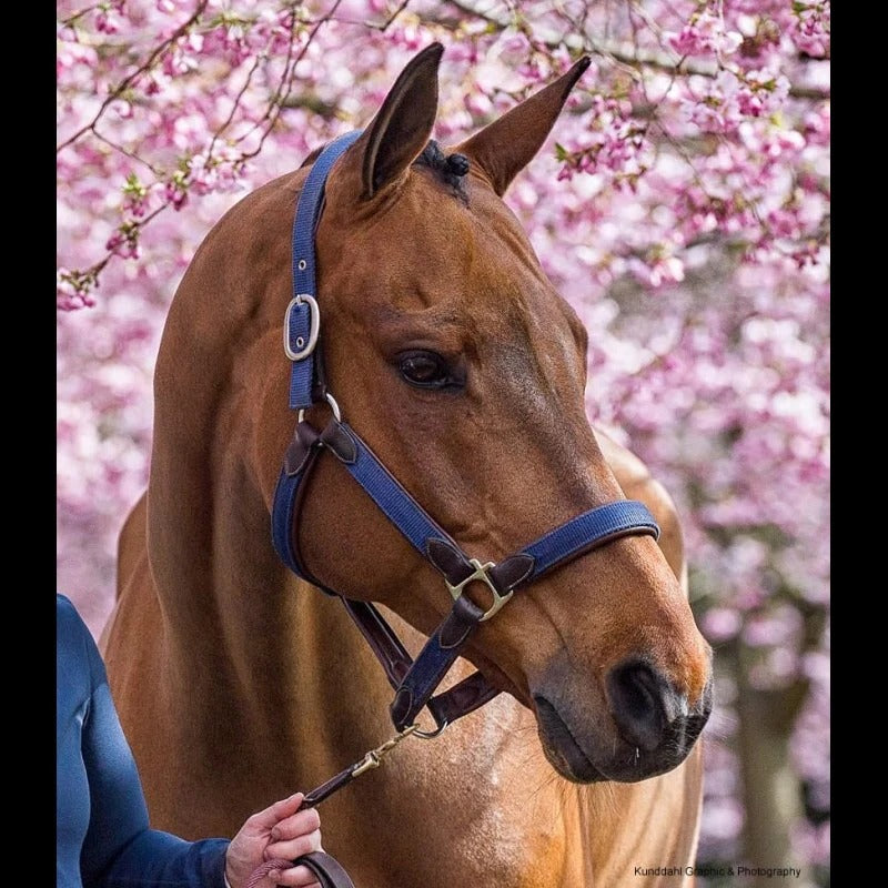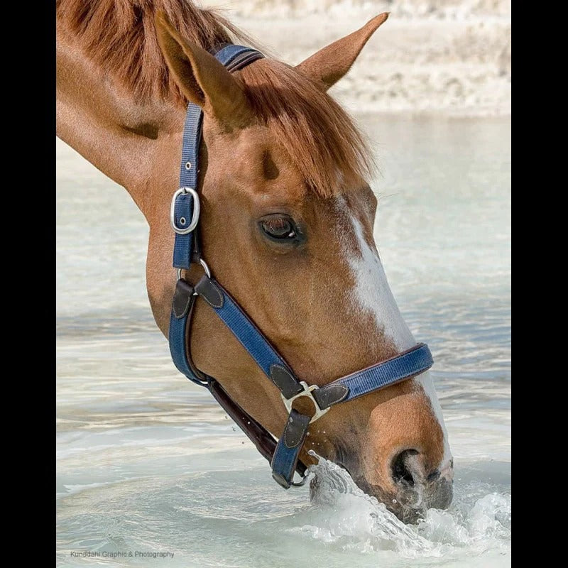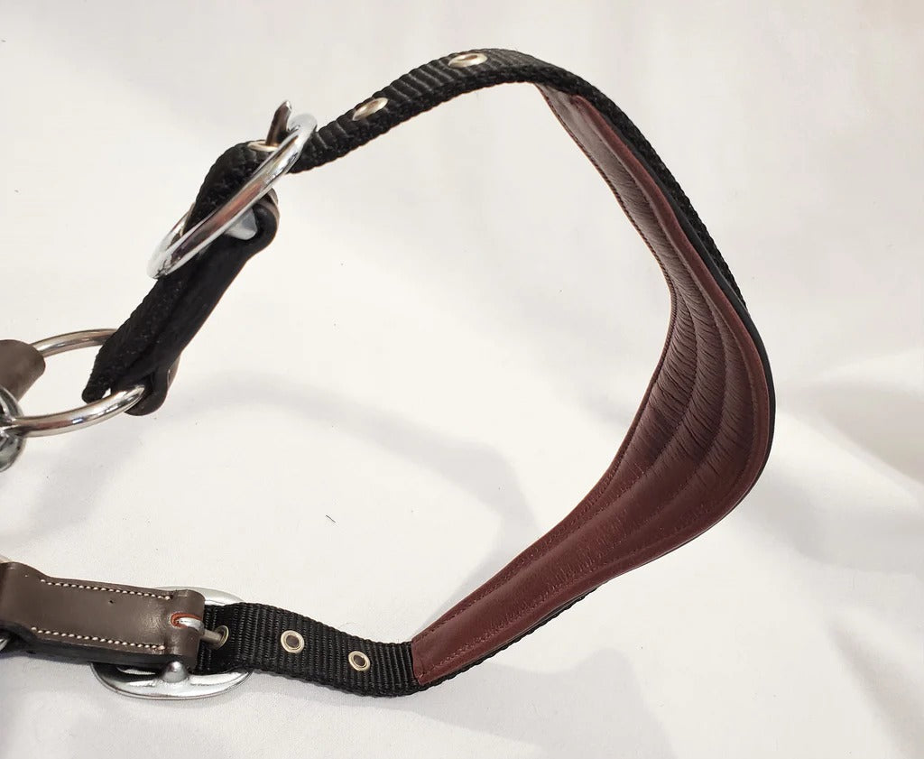 Halter with brown buffalo leather padding. Headpiece adjustable on both sides, wide leather padding. Throat part detachable on the left side. Coordinates with the Dy'on Lead Rope. Cream stitching, and steel fittings.