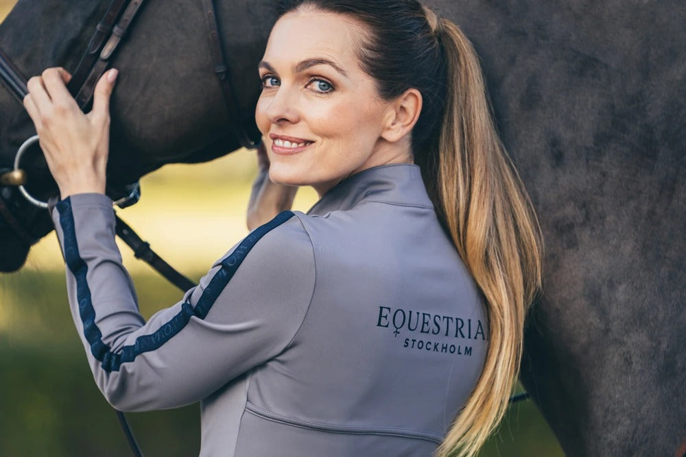 Our Power Top in grey is designed to make you feel unstoppable! The top is made of recycled polyester, is breathable and feels soft and comfortable all day. Decorated with a black Equestrian Stockholm Power woman logo on both sleeves, on the back and tone-on-tone logo on the collar. Wear it with other products from the Sportive Blue Ash collection for a complete look! The top comes in a wide size range to fit you perfectly.