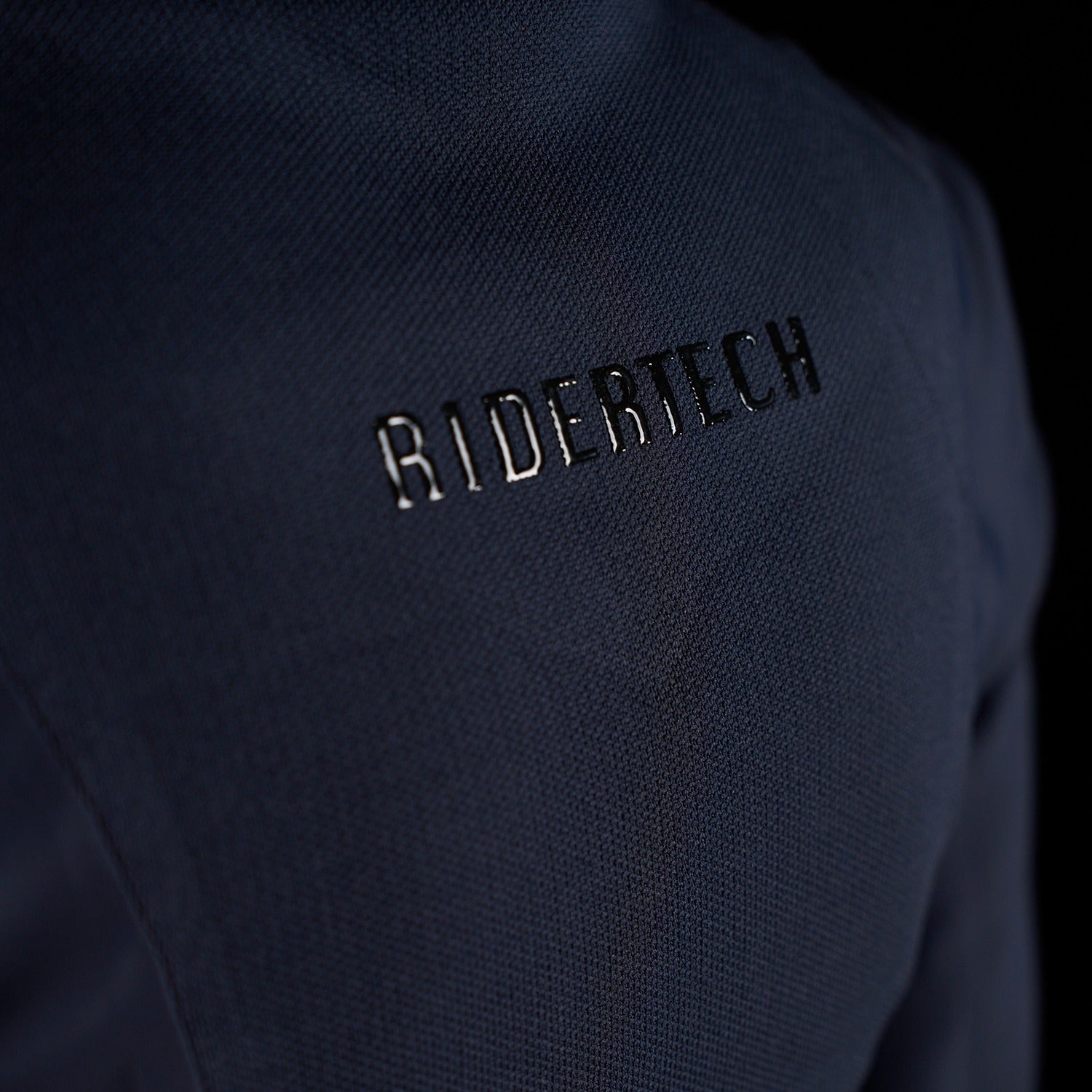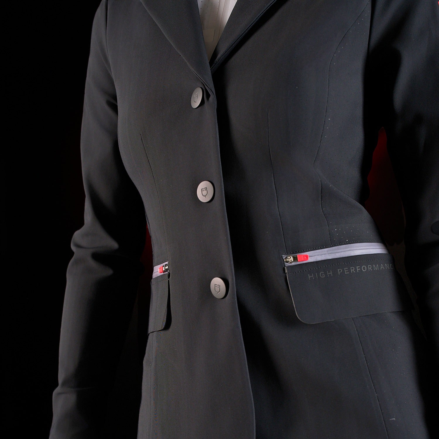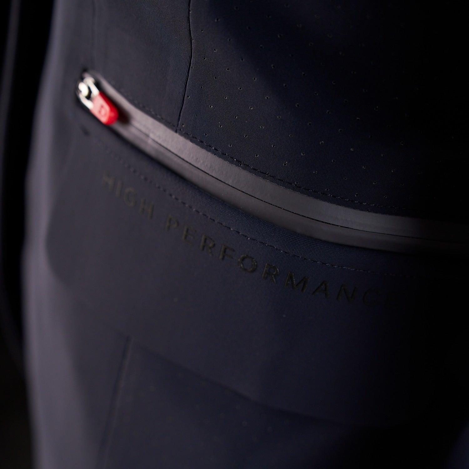 This jacket was designed to guarantee freshness and a dry sensation, as a matter of fact the highly breathable fabric promotes excellent regulation of body temperature. The knitted inserts on the back offer maximum freedom of movement. The minimal and refined design is enriched by a three-button closure and side bellows pockets. The jacket features the Equestro logo printed in red on the left sleeve, black and red zips on the pockets and tone-on-tone Ridertech lettering on the back.