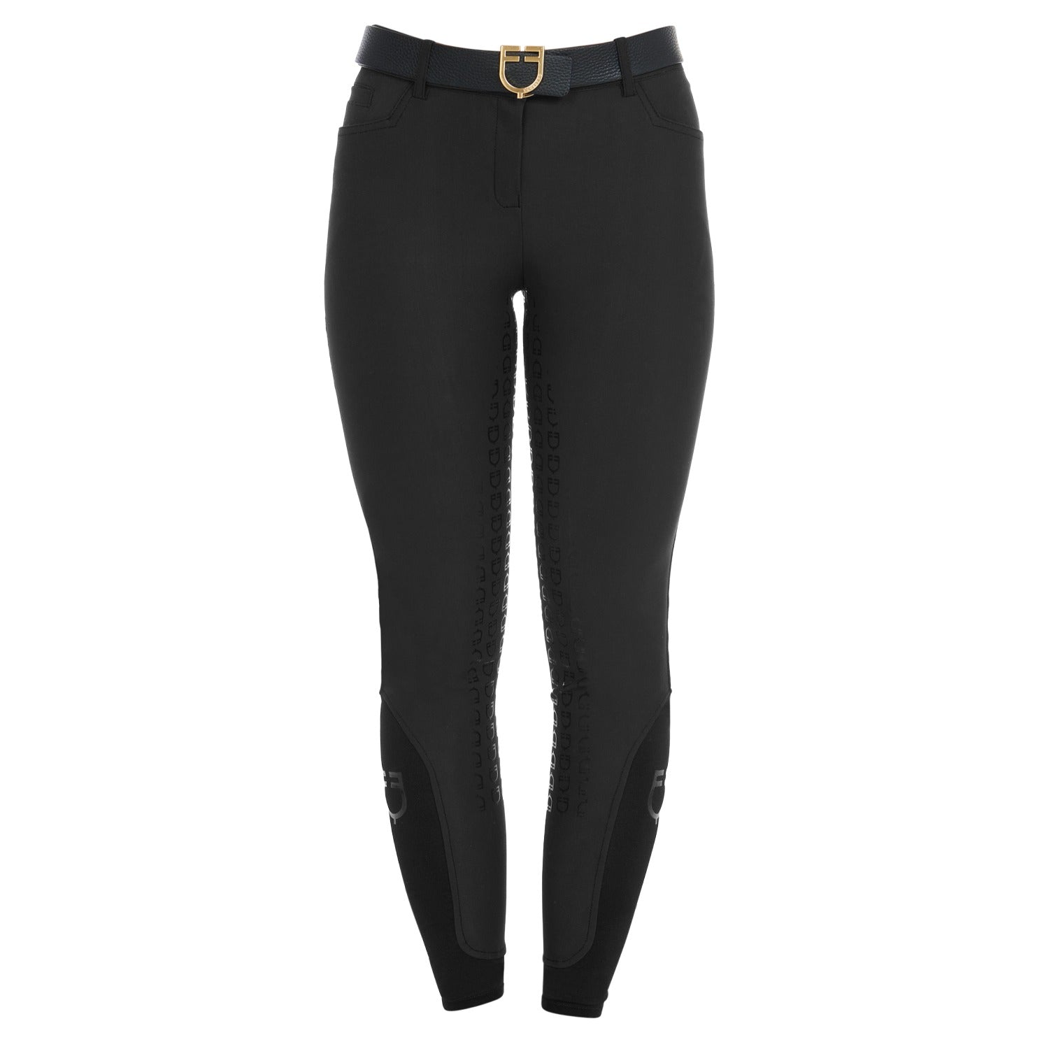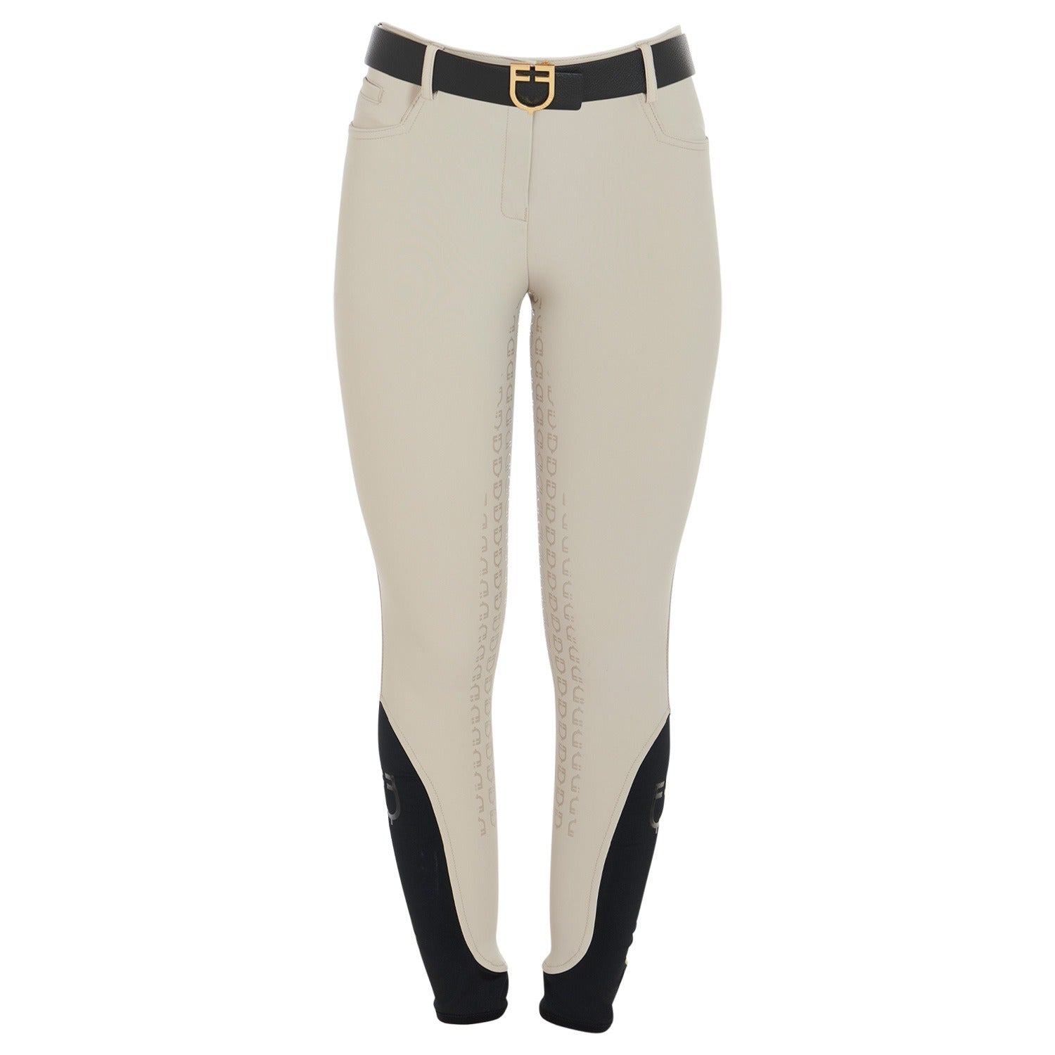 Women's Aria slim fit breeches in latest generation bielastic and breathable technical fabric. The full silicone grip with Equestro Logo guarantees excellent stability.