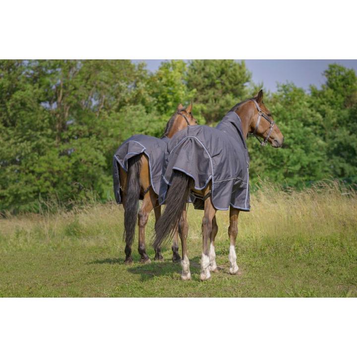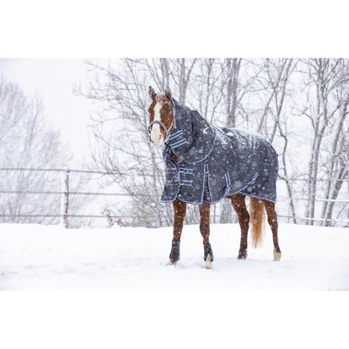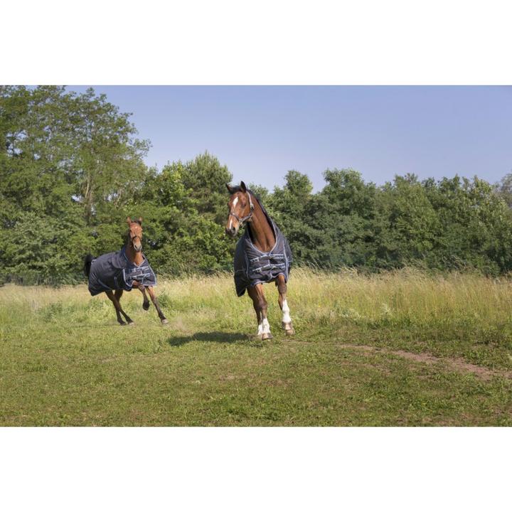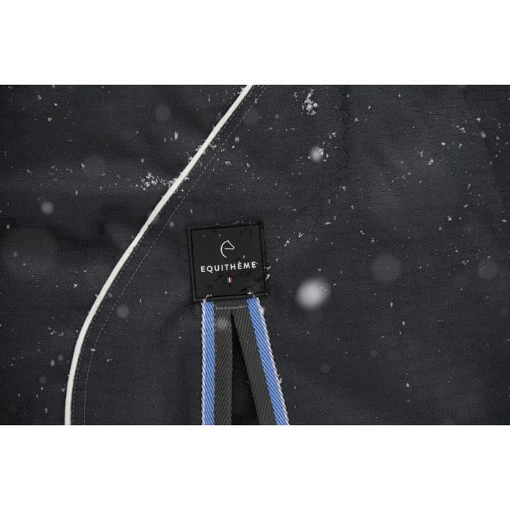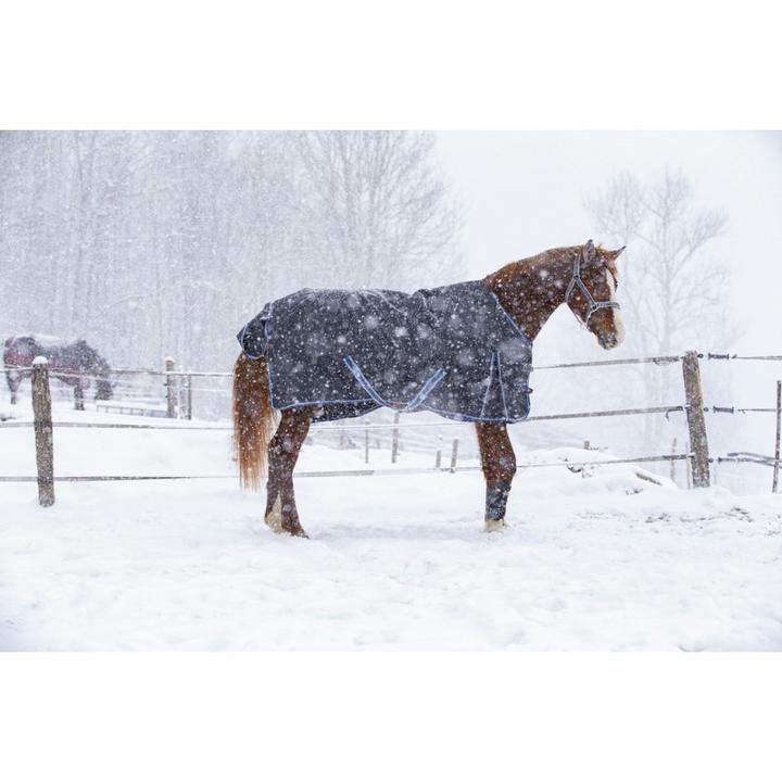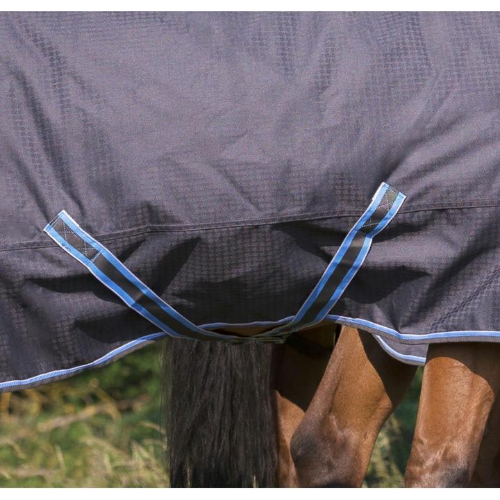 The Equitheme Tyrex 8000-8000 Rug in Blue and Grey is the ultimate choice for your horse's protection and comfort. Crafted from durable 1200 Denier ripstop polyester with taped seams, it boasts exceptional waterproofing (over 8000 mm/m²) and breathability (over 8000 mvp), making it ideal for various weather conditions. The antistatic and anti-chafing polyester taffeta lining and thermo-bonded fiber insulation ensure your horse's cozy and irritation-free.