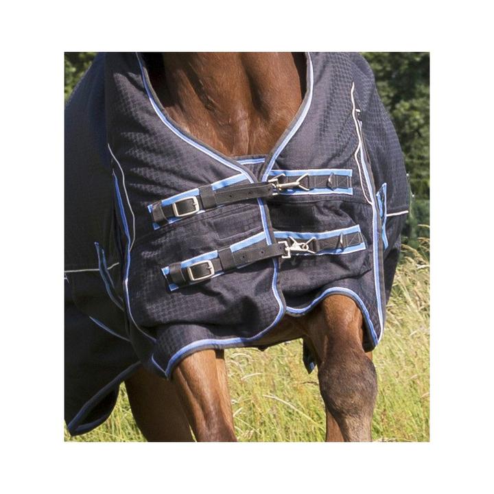 This rug features a deep design without a back seam and includes an extra-long 32cm "soft touch" micro-polar fleece padding at the withers for added comfort. It comes equipped with gussets, low-cross surcingles, and adjustable/removable elastic thigh straps with snaps, a tail flap, and a tail strap for comprehensive coverage. The chest closure is adjustable with straps and secures quickly with dual fastening snaps reinforced by self-gripping bands and satin finish metal buckles. Elevate your horse's protection and style with the Equitheme Tyrex 8000-8000 Rug in Blue and Grey.
