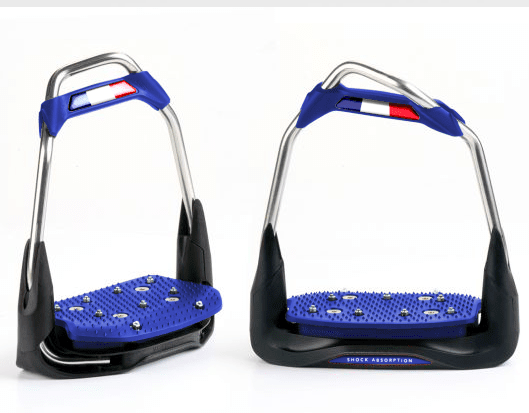 The AIR’S STIRRUPS set a new standard in the world of traditional stirrups. Made of stainless steel, with a platform mounted on Air Cushion, the AIR’S stirrup comes with a complete customization of the technical choices : eye orientation and/or inclination of the platform. The upper polyamide headband is designed to trigger in case of high pressure to facilitate the release of the foot if necessary. The colours of the stickers, the platform and the elastomer are customizable for a unique look.