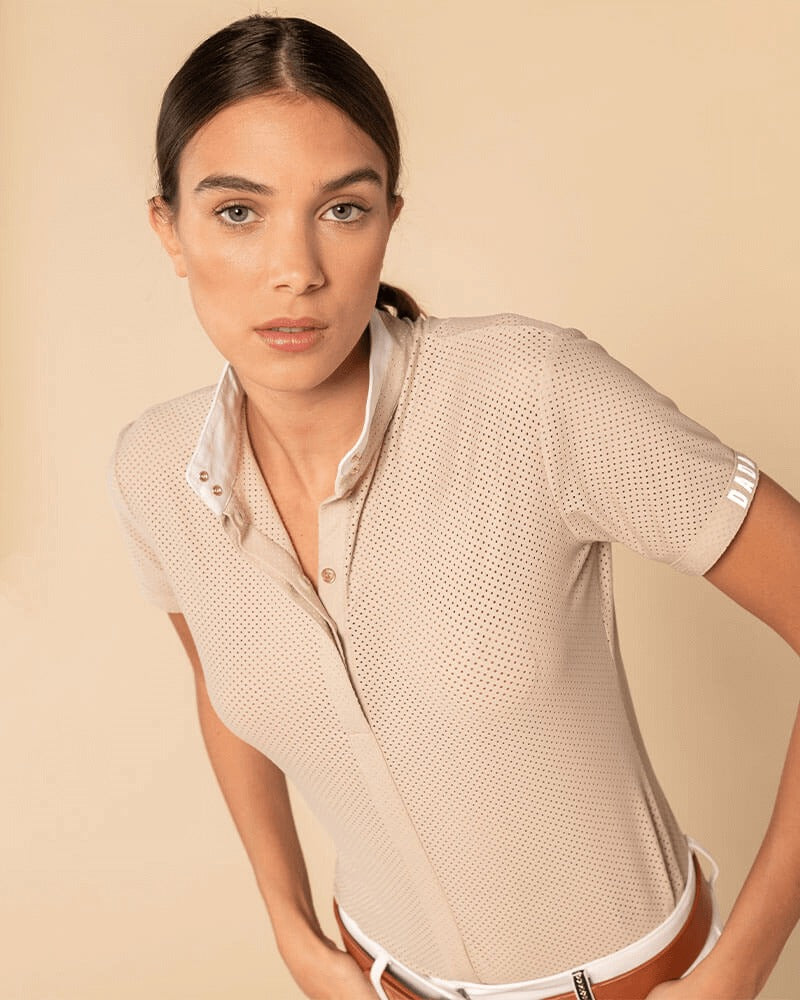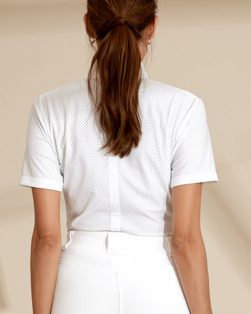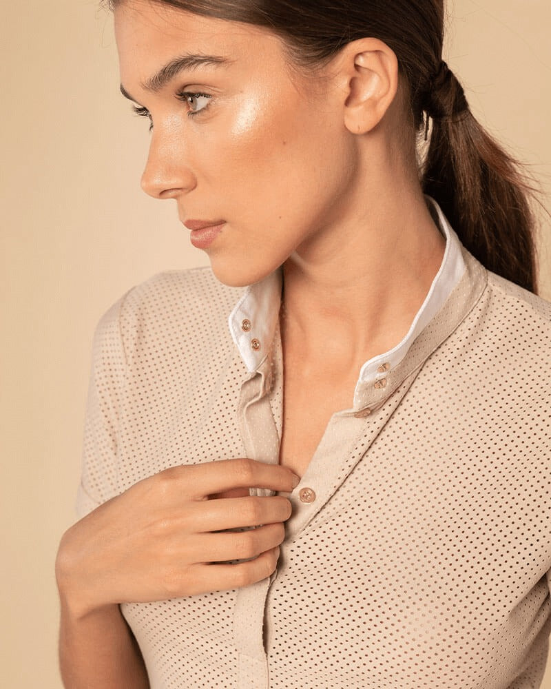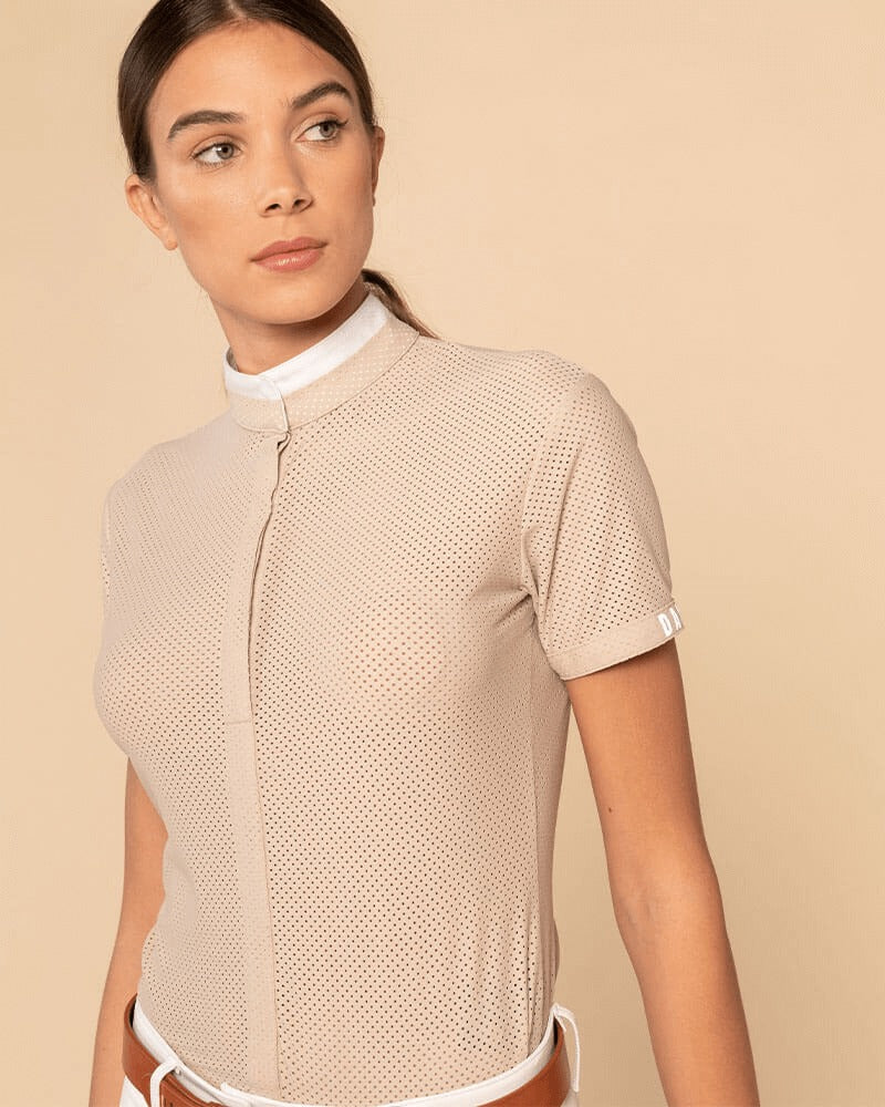 Technical polo shirt with short sleeves in micro perforated fabric for summer with a pure design. Rigid officer collar.