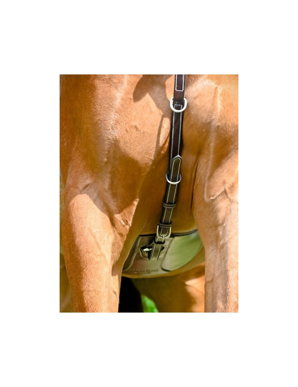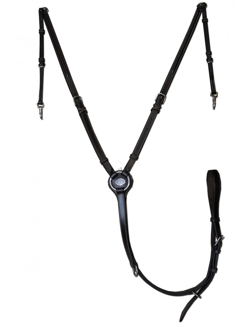 Matching the Tuesday Bridle with the contrasting topstitch, the breastplate must be attached to the saddle's little rings. The breastplate helps keep the saddle in place during a whole session so it doesn't shift back on the horse's back.