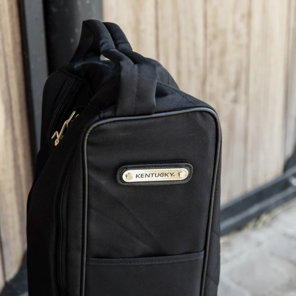 The Kentucky Horsewear Boots Bag offers protection to your boots during transportation, at shows or at home. The Boots Bag has artificial rabbit skin on the inside to avoid scratches on the leather. The name tag on the front can be turned over and personalized. The Boots Bag can be easily carried thanks to the handle on the top or to the long nylon strap, which can be adjusted in length. The Boots Bag has the same diamond quilting and artificial leather piping as our Bridle Bag, stable set (curtain, guard, head protector) and our rugs! Therefore, this Boots Bag tops of the Kentucky show look. The Boots Bag is machine washable at 30°, no dryer.