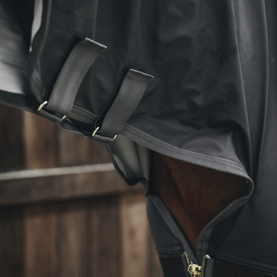 The Rain Coat is a must have for every competition rider to protect his horse and his expensive tack against heavy rain. It is compact, lightweight and 100% waterproof. It is easy to put over another rug or saddle while walking the horse on rainy days. The material is 100% polyester with a PU coating on the outside and will guarantee your rug to be 100% waterproof. There is a small Velcro at the poll to attach the neckpiece to your halter or bridle. You can also find Velcro straps at the neck, a single front closure, a surcingle and tail cord to keep your rug in place. The rug is machine washable at 30°, no dryer.